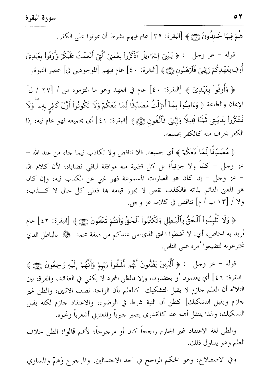 قوله-عز وجل-: {الَّذِينَ يَظُنُّونَ أَنَّهُمْ مُلاقُوا رَبِّهِمْ وَأَنَّهُمْ إِلَيْهِ راجِعُونَ} (46) [البقرة: 46] أي يعلمون أو يعتقدون، وإلا فالظن المجرد لا يكفي في العقائد، والفرق بين الثلاثة أن العلم جازم لا يقبل التشكيك [كالعلم بأن الواحد نصف الاثنين، والظن غير جازم ويقبل التشكيك] كظن أن النية شرط في الوضوء، والاعتقاد جازم لكنه يقبل التشكيك، ولهذا ينتقل أهله عنه كالقدري يصير جبريا والمعتزلي أشعريا ونحوه.