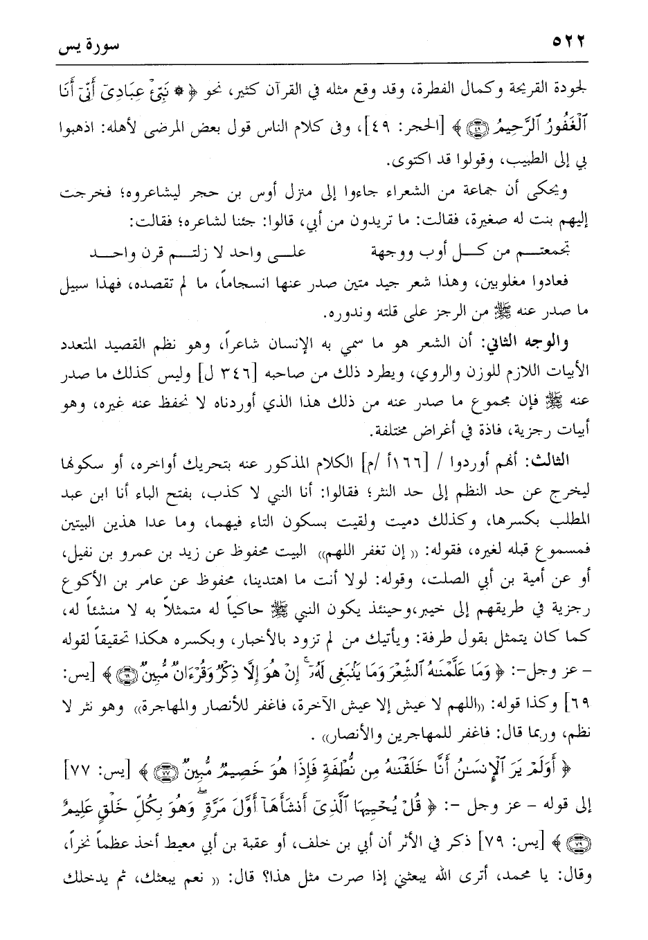 والوجه الثاني: أن الشعر هو ما سمي به الإنسان شاعرا، وهو نظم القصيد المتعدد الأبيات اللازم للوزن والروي، ويطرد ذلك من صاحبه [346 ل] وليس كذلك ما صدر عنه صلّى الله عليه وسلّم فإن مجموع ما صدر عنه من ذلك هذا الذي أوردناه لا نحفظ عنه غيره، وهو أبيات رجزية، فاذة في أغراض مختلفة.