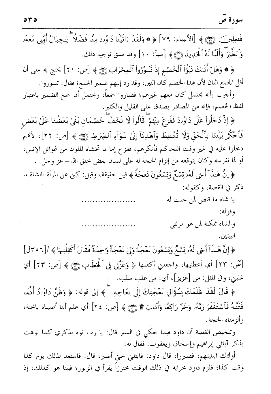 {إِنَّ هذا أَخِي لَهُ تِسْعٌ وَتِسْعُونَ نَعْجَةً} قيل حقيقة، وقيل: كنى عن المرأة بالشاة لما ذكر في القصة، وكقوله: