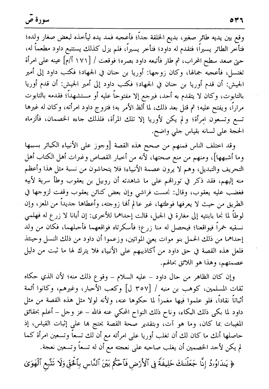 وإن كان الظاهر من حال داود-عليه السّلام-وقوع ذلك منه؛ لأن الذي حكاه ثقات المسلمين، كوهب بن منبه/ [357 ل] وكعب الأحبار، وغيرهم، وكانوا أئمة أثباتا نقادا، فلو علموا فيها مغمزا لما حكوها عنه، ولأنه لولا مثل هذه القصة من مثل داود لما بكى ذلك البكاء، وناح ذلك النواح المحكي عنه فالله-عز وجل-أعلم بحقائق المغيبات بما كان، وما هو آت، وبتقدير صحة القصة يحتج بها على إثبات القياس، إذ حاصلها أنك ما كان لك أن تغلب أوريا على امرأته مع أن لك تسعا وتسعين امرأة كما لم يكن لأحد الخصمين أن يغلب صاحبه على نعجته مع أن له تسعا وتسعين نعجة.