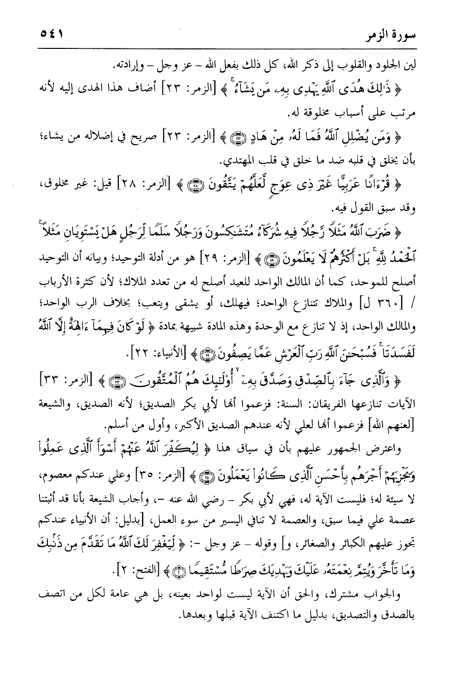واعترض الجمهور عليهم بأن في سياق هذا {لِيُكَفِّرَ اللهُ عَنْهُمْ أَسْوَأَ الَّذِي عَمِلُوا وَيَجْزِيَهُمْ أَجْرَهُمْ بِأَحْسَنِ الَّذِي كانُوا يَعْمَلُونَ} (35) [الزمر: 35] وعلي عندكم معصوم، لا سيئة له؛ فليست الآية له، فهي لأبي بكر-رضي الله عنه-، وأجاب الشيعة بأنا قد أثبتنا عصمة علي فيما سبق، والعصمة لا تنافي اليسير من سوء العمل، [بدليل: أن الأنبياء عندكم تجوز عليهم الكبائر والصغائر، و] وقوله-عز وجل-: {لِيَغْفِرَ لَكَ اللهُ ما تَقَدَّمَ مِنْ ذَنْبِكَ وَما تَأَخَّرَ وَيُتِمَّ نِعْمَتَهُ عَلَيْكَ وَيَهْدِيَكَ صِراطاً مُسْتَقِيماً} (2) [الفتح: 2].