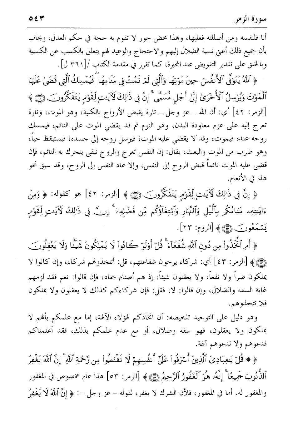 {اللهُ يَتَوَفَّى الْأَنْفُسَ حِينَ مَوْتِها وَالَّتِي لَمْ تَمُتْ فِي مَنامِها فَيُمْسِكُ الَّتِي قَضى عَلَيْهَا الْمَوْتَ وَيُرْسِلُ الْأُخْرى إِلى أَجَلٍ مُسَمًّى إِنَّ فِي ذلِكَ لَآياتٍ لِقَوْمٍ يَتَفَكَّرُونَ} (42) [الزمر: 42] أي: أن الله-عز وجل-تارة يقبض الأرواح بالكلية، وهو الموت، وتارة تعرج إليه على عزم معاودة البدن، وهو النوم ثم قد يقضي الموت على النائم، فيمسك روحه عنده فيموت، وقد لا يقضي عليه الموت؛ فيرسل روحه إلى جسده؛ فيستيقظ حيا، وهو ضرب من الموت والبعث، يقال: إن النفس تعرج والروح تبقى يتحرك به النائم، فإن قضى عليه الموت نائما قبض الروح إلى النفس، وإلا عاد النفس إلى الروح، وقد سبق نحو هذا في الأنعام.