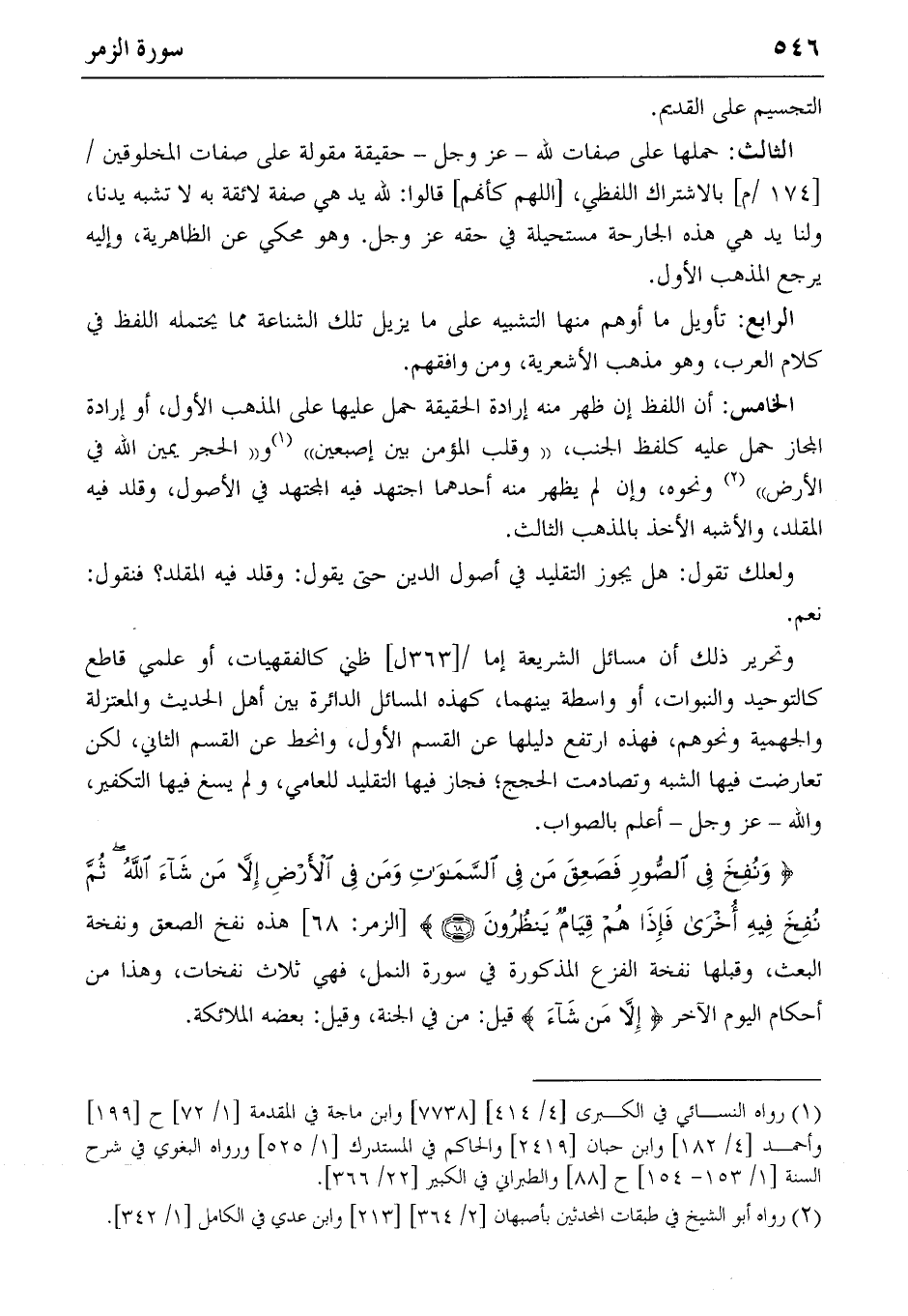 {وَنُفِخَ فِي الصُّورِ فَصَعِقَ مَنْ فِي السَّماواتِ وَمَنْ فِي الْأَرْضِ إِلاّ مَنْ شاءَ اللهُ ثُمَّ نُفِخَ فِيهِ أُخْرى فَإِذا هُمْ قِيامٌ يَنْظُرُونَ} (68) [الزمر: 68] هذه نفخ الصعق ونفخة البعث، وقبلها نفخة الفزع المذكورة في سورة النمل، فهي ثلاث نفخات، وهذا من أحكام اليوم الآخر {إِلاّ مَنْ شاءَ} قيل: من في الجنة، وقيل: بعضه الملائكة.