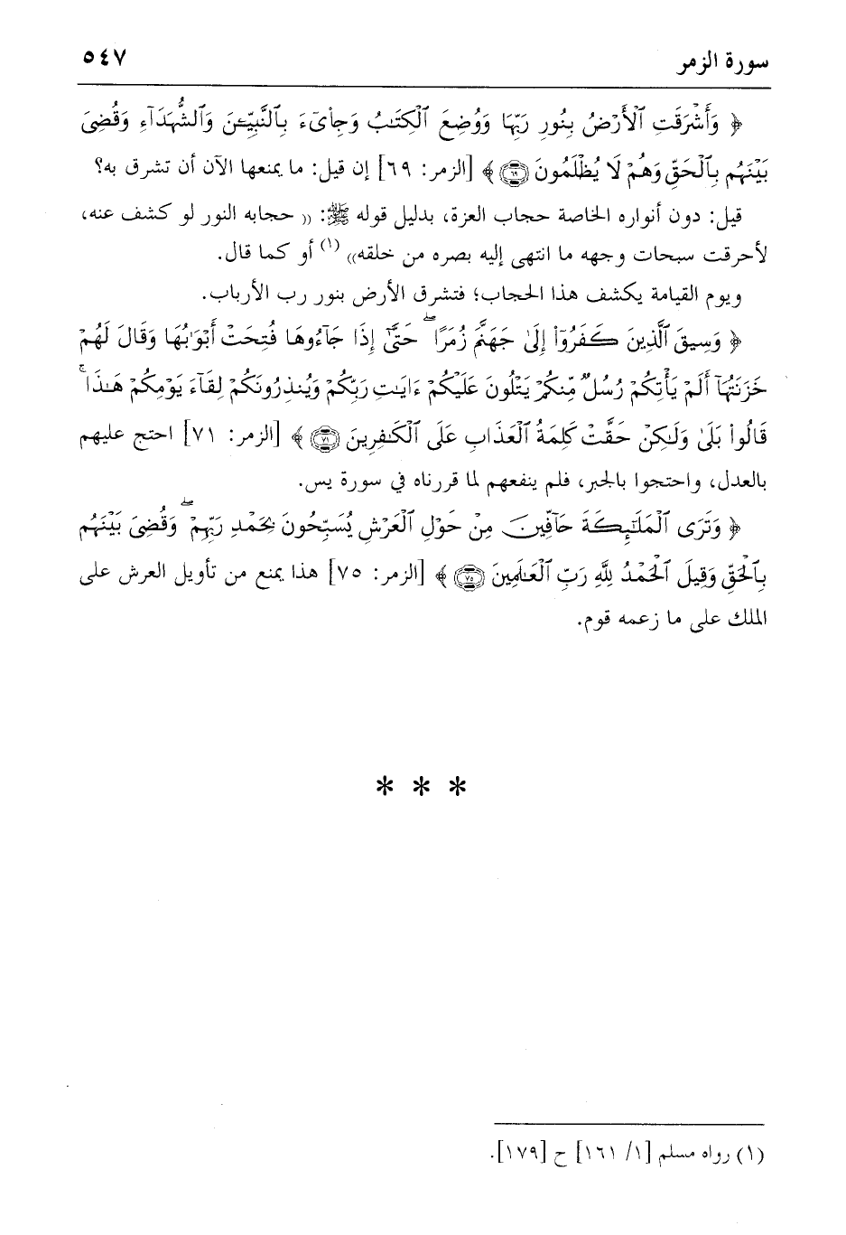 {وَتَرَى الْمَلائِكَةَ حَافِّينَ مِنْ حَوْلِ الْعَرْشِ يُسَبِّحُونَ بِحَمْدِ رَبِّهِمْ وَقُضِيَ بَيْنَهُمْ بِالْحَقِّ وَقِيلَ الْحَمْدُ لِلّهِ رَبِّ الْعالَمِينَ} (75) [الزمر: 75] هذا يمنع من تأويل العرش على الملك على ما زعمه قوم.