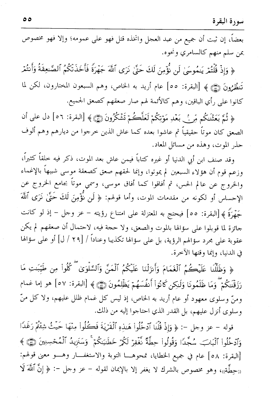 {وَإِذْ قُلْتُمْ يا مُوسى لَنْ نُؤْمِنَ لَكَ حَتّى نَرَى اللهَ جَهْرَةً فَأَخَذَتْكُمُ الصّاعِقَةُ وَأَنْتُمْ تَنْظُرُونَ} (55) [البقرة: 55] عام أريد به الخاص، وهم السبعون المختارون، لكن لما كانوا على رأي الباقين، وهم كالأئمة لهم صار صعقهم كصعق الجميع.