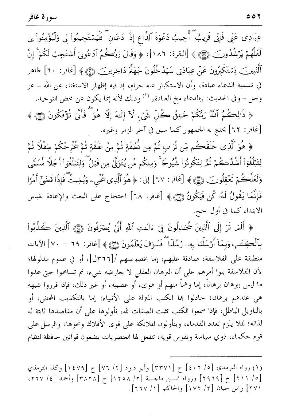 عِبادِي عَنِّي فَإِنِّي قَرِيبٌ أُجِيبُ دَعْوَةَ الدّاعِ إِذا دَعانِ فَلْيَسْتَجِيبُوا لِي وَلْيُؤْمِنُوا بِي لَعَلَّهُمْ يَرْشُدُونَ (186) [البقرة: 186]، {وَقالَ رَبُّكُمُ اُدْعُونِي أَسْتَجِبْ لَكُمْ إِنَّ الَّذِينَ يَسْتَكْبِرُونَ عَنْ عِبادَتِي سَيَدْخُلُونَ جَهَنَّمَ داخِرِينَ} (60) [غافر: 60] ظاهر في تسمية الدعاء عبادة، وأن الاستكبار عنه حرام، إذ فيه إظهار الاستغناء عن الله-عز وجل-وفى الحديث: «الدعاء مخ العبادة» (1) وذلك لأنه إنما يكون عن محض التوحيد.
