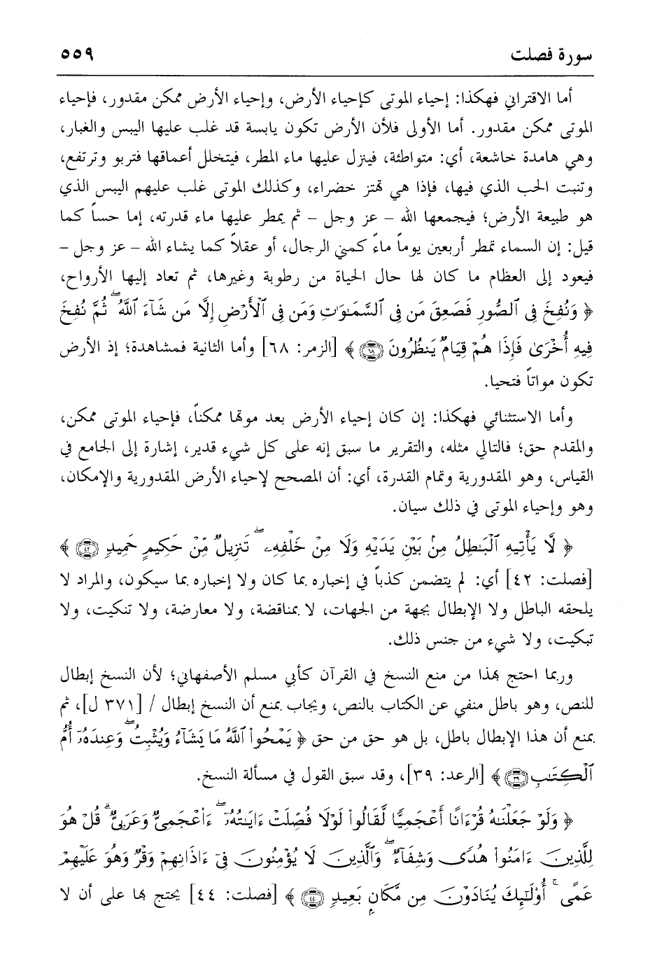 وربما احتج بهذا من منع النسخ في القرآن كأبي مسلم الأصفهاني؛ لأن النسخ إبطال للنص، وهو باطل منفي عن الكتاب بالنص، ويجاب بمنع أن النسخ إبطال/ [371 ل]، ثم بمنع أن هذا الإبطال باطل، بل هو حق من حق {يَمْحُوا اللهُ ما يَشاءُ وَيُثْبِتُ وَعِنْدَهُ أُمُّ الْكِتابِ} (39) [الرعد: 39]، وقد سبق القول في مسألة النسخ.