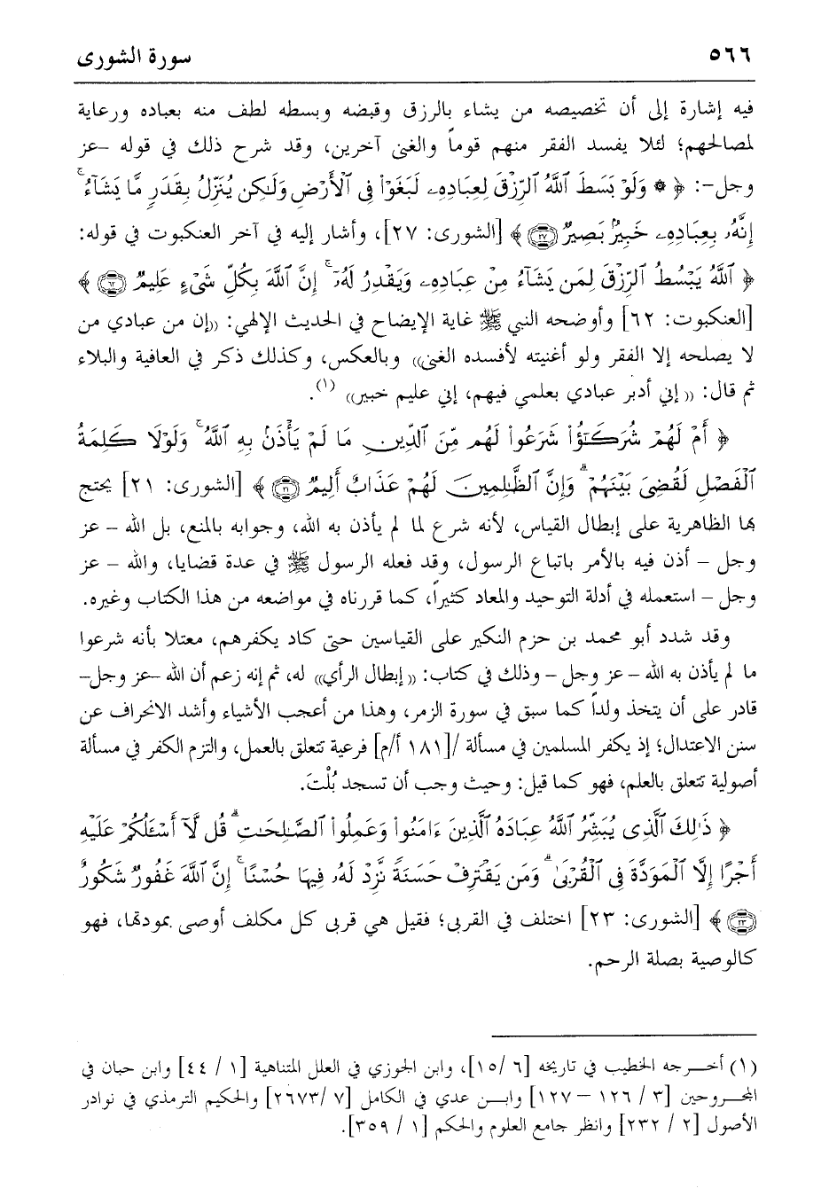 {أَمْ لَهُمْ شُرَكاءُ شَرَعُوا لَهُمْ مِنَ الدِّينِ ما لَمْ يَأْذَنْ بِهِ اللهُ وَلَوْلا كَلِمَةُ الْفَصْلِ لَقُضِيَ بَيْنَهُمْ وَإِنَّ الظّالِمِينَ لَهُمْ عَذابٌ أَلِيمٌ} (21) [الشورى: 21] يحتج بها الظاهرية على إبطال القياس، لأنه شرع لما لم يأذن به الله، وجوابه بالمنع، والله-عز وجل-أذن فيه بالأمر باتباع الرسول، وقد فعله الرسول صلّى الله عليه وسلّم في عدة قضايا، والله-عز وجل-استعمله في أدلة التوحيد والمعاد كثيرا، كما قررناه في مواضعه من هذا الكتاب وغيره.