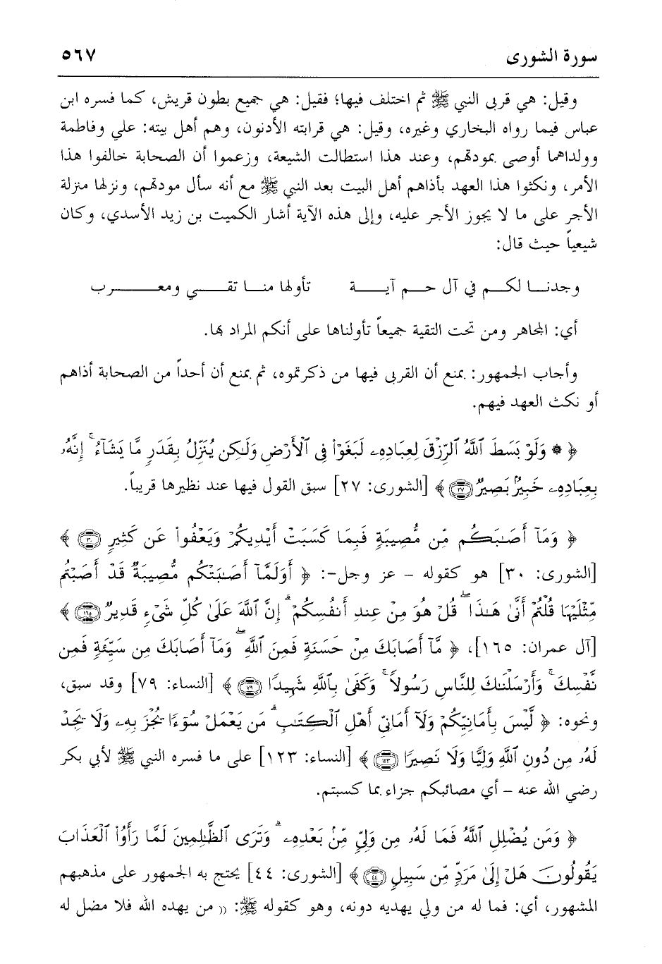وقيل: هي قربى النبي صلّى الله عليه وسلّم ثم اختلف فيها؛ فقيل: هي جميع بطون قريش، كما فسره ابن عباس فيما رواه البخاري وغيره، وقيل: هي قرابته الأدنون، وهم أهل بيته: علي وفاطمة وولداهما أوصى بمودتهم، وعند هذا استطالت الشيعة، وزعموا أن الصحابة خالفوا هذا الأمر، ونكثوا هذا العهد بأذاهم أهل البيت بعد النبي صلّى الله عليه وسلّم مع أنه سأل مودتهم، ونزلها منزلة الأجر على ما لا يجوز الأجر عليه، وإلى هذه الآية أشار الكميت بن زيد الأسدي، وكان شيعيا حيث قال: