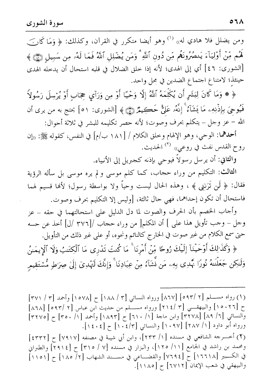 {* وَما كانَ لِبَشَرٍ أَنْ يُكَلِّمَهُ اللهُ إِلاّ وَحْياً أَوْ مِنْ وَراءِ حِجابٍ أَوْ يُرْسِلَ رَسُولاً فَيُوحِيَ بِإِذْنِهِ ما يَشاءُ إِنَّهُ عَلِيٌّ حَكِيمٌ} (51) [الشورى: 51] يحتج به من يرى أن الله-عز وجل-يتكلم بحرف وصوت؛ لأنه حصر تكليمه للبشر في ثلاثة أحوال: