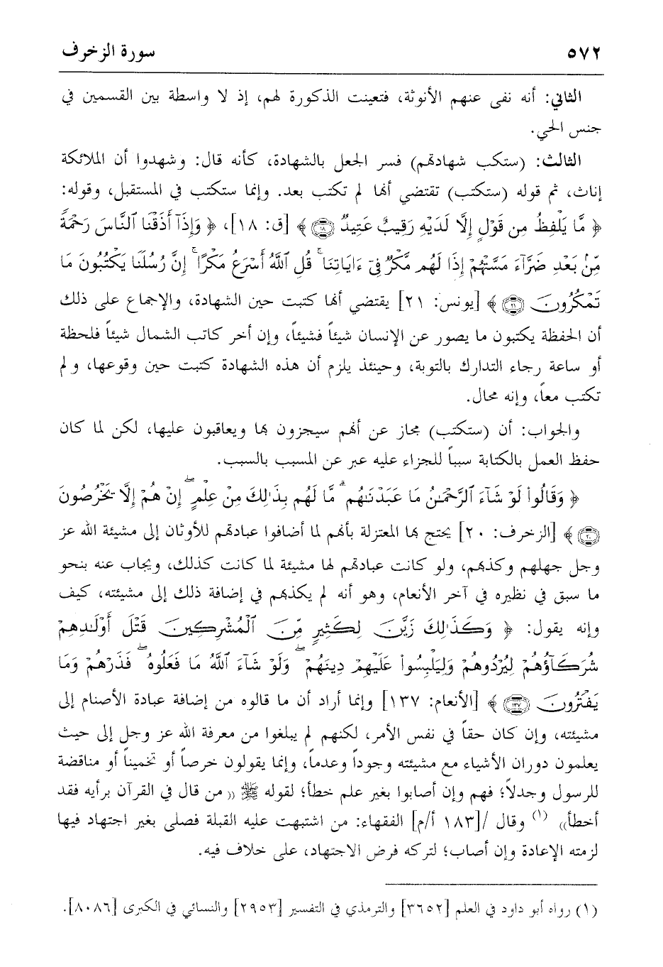 الثالث: (ستكب شهادتهم) فسر الجعل بالشهادة، كأنه قال: وشهدوا أن الملائكة إناث، ثم قوله (ستكتب) تقتضي أنها لم تكتب بعد. وإنما ستكتب في المستقبل، وقوله: {ما يَلْفِظُ مِنْ قَوْلٍ إِلاّ لَدَيْهِ رَقِيبٌ عَتِيدٌ} (18) [ق: 18]، {وَإِذا أَذَقْنَا النّاسَ رَحْمَةً مِنْ بَعْدِ ضَرّاءَ مَسَّتْهُمْ إِذا لَهُمْ مَكْرٌ فِي آياتِنا قُلِ اللهُ أَسْرَعُ مَكْراً إِنَّ رُسُلَنا يَكْتُبُونَ ما تَمْكُرُونَ} (21) [يونس: 21] يقتضي أنها كتبت حين الشهادة، والإجماع على ذلك أن الحفظة يكتبون ما يصور عن الإنسان شيئا فشيئا، وإن أخر كاتب الشمال شيئا فلحظة أو ساعة رجاء التدارك بالتوبة، وحينئذ يلزم أن هذه الشهادة كتبت حين وقوعها، ولم تكتب معا، وإنه محال.