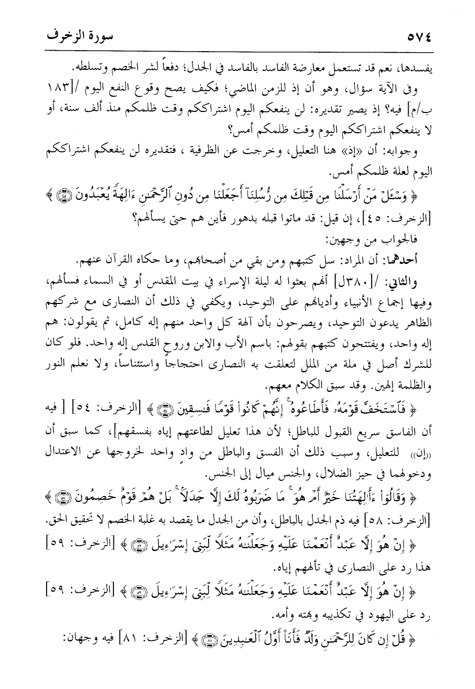 {وَقالُوا أَآلِهَتُنا خَيْرٌ أَمْ هُوَ ما ضَرَبُوهُ لَكَ إِلاّ جَدَلاً بَلْ هُمْ قَوْمٌ خَصِمُونَ} (58) [الزخرف: 58] فيه ذم الجدل بالباطل، وأن من الجدل ما يقصد به غلبة الخصم لا تحقيق الحق.