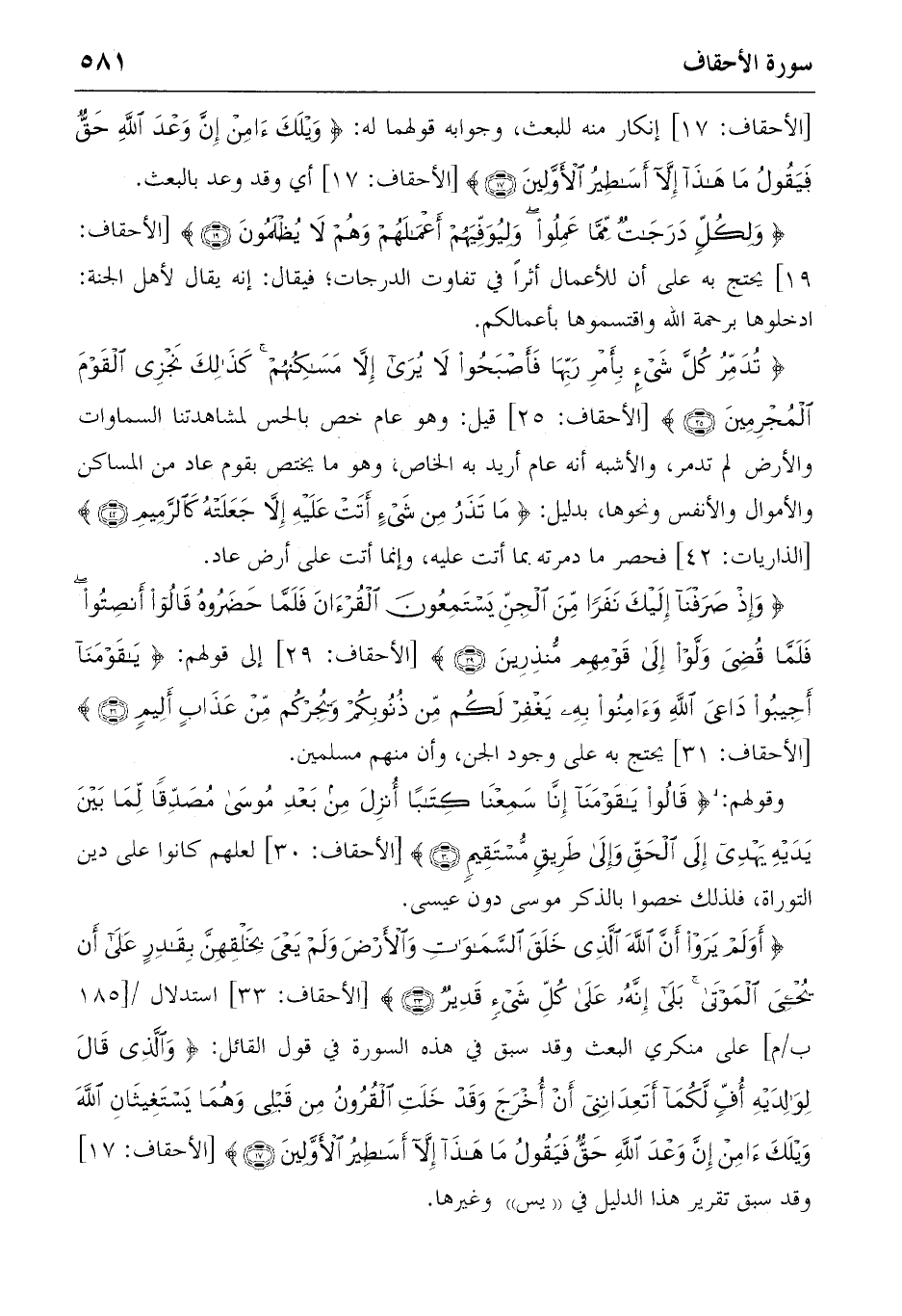 {أَوَلَمْ يَرَوْا أَنَّ اللهَ الَّذِي خَلَقَ السَّماواتِ وَالْأَرْضَ وَلَمْ يَعْيَ بِخَلْقِهِنَّ بِقادِرٍ عَلى أَنْ يُحْيِيَ الْمَوْتى بَلى إِنَّهُ عَلى كُلِّ شَيْءٍ قَدِيرٌ} (33) [الأحقاف: 33] استدلال/ [185 ب/م] على منكري البعث وقد سبق في هذه السورة في قول القائل: {وَالَّذِي قالَ لِوالِدَيْهِ أُفٍّ لَكُما أَتَعِدانِنِي أَنْ أُخْرَجَ وَقَدْ خَلَتِ الْقُرُونُ مِنْ قَبْلِي وَهُما يَسْتَغِيثانِ اللهَ وَيْلَكَ آمِنْ إِنَّ وَعْدَ اللهِ حَقٌّ فَيَقُولُ ما هذا إِلاّ أَساطِيرُ الْأَوَّلِينَ} (17) [الأحقاف: 17] وقد سبق تقرير هذا الدليل في «يس» وغيرها.