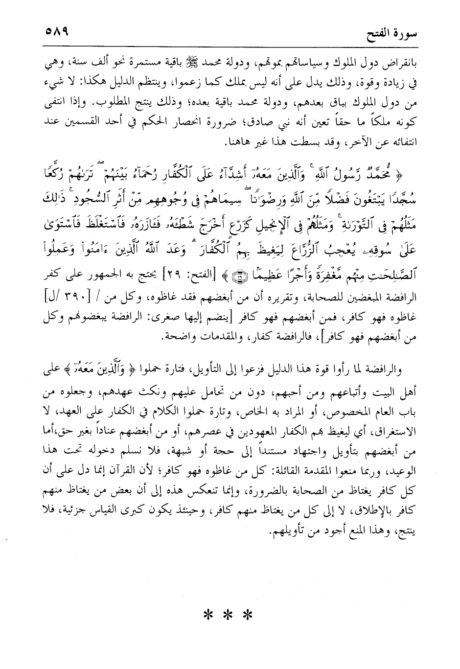 {مُحَمَّدٌ رَسُولُ اللهِ وَالَّذِينَ مَعَهُ أَشِدّاءُ عَلَى الْكُفّارِ رُحَماءُ بَيْنَهُمْ تَراهُمْ رُكَّعاً سُجَّداً يَبْتَغُونَ فَضْلاً مِنَ اللهِ وَرِضْواناً سِيماهُمْ فِي وُجُوهِهِمْ مِنْ أَثَرِ السُّجُودِ ذلِكَ مَثَلُهُمْ فِي التَّوْراةِ وَمَثَلُهُمْ فِي الْإِنْجِيلِ كَزَرْعٍ أَخْرَجَ شَطْأَهُ فَآزَرَهُ فَاسْتَغْلَظَ فَاسْتَوى عَلى سُوقِهِ يُعْجِبُ الزُّرّاعَ لِيَغِيظَ بِهِمُ الْكُفّارَ وَعَدَ اللهُ الَّذِينَ آمَنُوا وَعَمِلُوا الصّالِحاتِ مِنْهُمْ مَغْفِرَةً وَأَجْراً عَظِيماً} (29) [الفتح: 29] يحتج به الجمهور على كفر الرافضة المبغضين للصحابة، وتقريره أن من أبغضهم فقد غاظوه، وكل من/ [390/ل] غاظوه فهو كافر، فمن أبغضهم فهو كافر [ينضم إليها صغرى: الرافضة يبغضونهم وكل من أبغضهم فهو كافر]، فالرافضة كفار، والمقدمات واضحة.