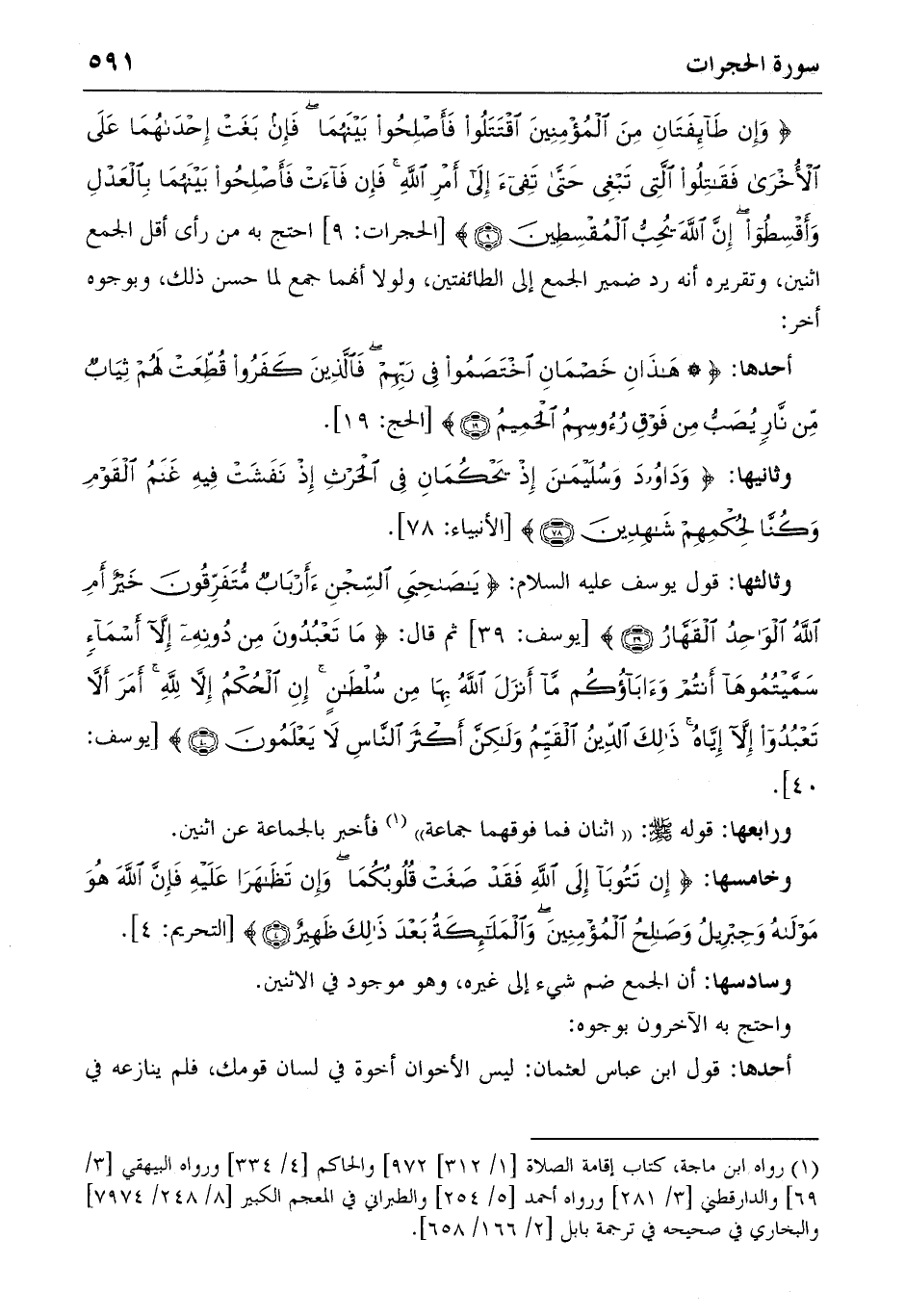{وَإِنْ طائِفَتانِ مِنَ الْمُؤْمِنِينَ اِقْتَتَلُوا فَأَصْلِحُوا بَيْنَهُما فَإِنْ بَغَتْ إِحْداهُما عَلَى الْأُخْرى فَقاتِلُوا الَّتِي تَبْغِي حَتّى تَفِيءَ إِلى أَمْرِ اللهِ فَإِنْ فاءَتْ فَأَصْلِحُوا بَيْنَهُما بِالْعَدْلِ وَأَقْسِطُوا إِنَّ اللهَ يُحِبُّ الْمُقْسِطِينَ} (9) [الحجرات: 9] احتج به من رأى أقل الجمع اثنين، وتقريره أنه رد ضمير الجمع إلى الطائفتين، ولولا أنهما جمع لما حسن ذلك، وبوجوه أخر: