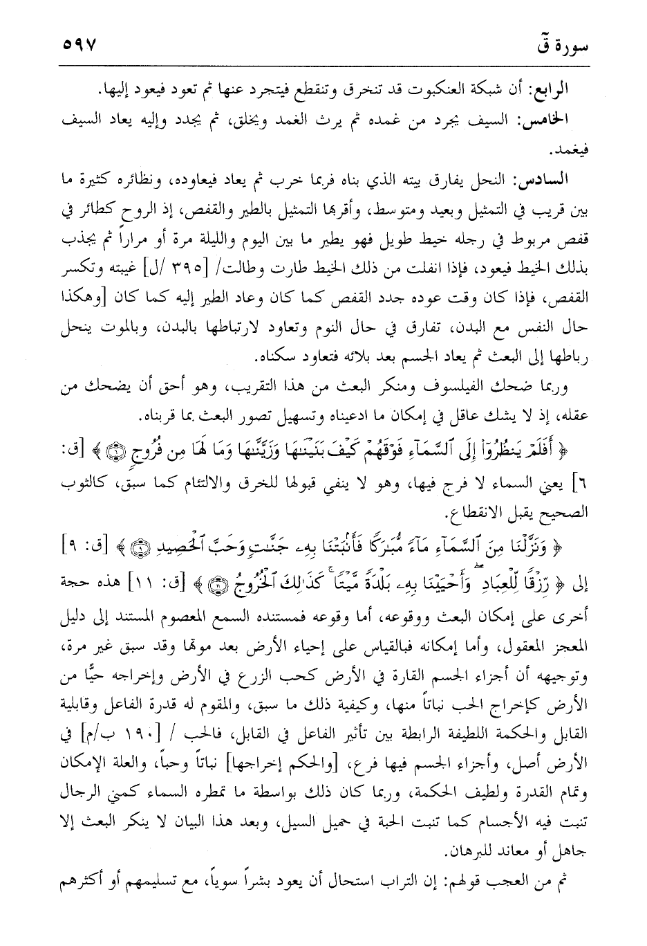 {وَنَزَّلْنا مِنَ السَّماءِ ماءً مُبارَكاً فَأَنْبَتْنا بِهِ جَنّاتٍ وَحَبَّ الْحَصِيدِ} (9) [ق: 9] إلى {رِزْقاً لِلْعِبادِ وَأَحْيَيْنا بِهِ بَلْدَةً مَيْتاً كَذلِكَ الْخُرُوجُ} (11) [ق: 11] هذه حجة أخرى على إمكان البعث ووقوعه، أما وقوعه فمستنده السمع المعصوم المستند إلى دليل المعجز المعقول، وأما إمكانه فبالقياس على إحياء الأرض بعد موتها وقد سبق غير مرة، وتوجيهه أن أجزاء الجسم القارة في الأرض كحب الزرع في الأرض وإخراجه حيّا من الأرض كإخراج الحب نباتا منها، وكيفية ذلك ما سبق، والمقوم له قدرة الفاعل وقابلية القابل والحكمة اللطيفة الرابطة بين تأثير الفاعل في القابل، فالحب/ [190 ب/م] في الأرض أصل، وأجزاء الجسم فيها فرع، [والحكم إخراجها] نباتا وحبا، والعلة الإمكان وتمام القدرة ولطيف الحكمة، وربما كان ذلك بواسطة ما تمطره السماء كمني الرجال تنبت فيه الأجسام كما تنبت الحبة في حميل السيل، وبعد هذا البيان لا ينكر البعث إلا جاهل أو معاند للبرهان.