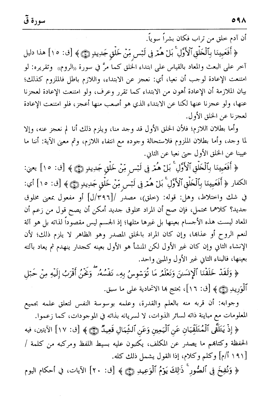 {أَفَعَيِينا بِالْخَلْقِ الْأَوَّلِ بَلْ هُمْ فِي لَبْسٍ مِنْ خَلْقٍ جَدِيدٍ} (15) [ق: 15] هذا دليل آخر على البعث والمعاد بالقياس على ابتداء الخلق كما مرّ في سورة «الروم» وتقريره: لو امتنعت الإعادة لوجب أن نعيا، أي: نعجز عن الابتداء، واللازم باطل فالملزوم كذلك؛ بيان الملازمة أن الإعادة أهون من الابتداء كما تقرر وعرف، ولو امتنعت الإعادة لعجزنا عنها، ولو عجزنا عنها لكنا عن الابتداء الذي هو أصعب منها أعجز، فلو امتنعت الإعادة لعجزنا عن الخلق الأول.