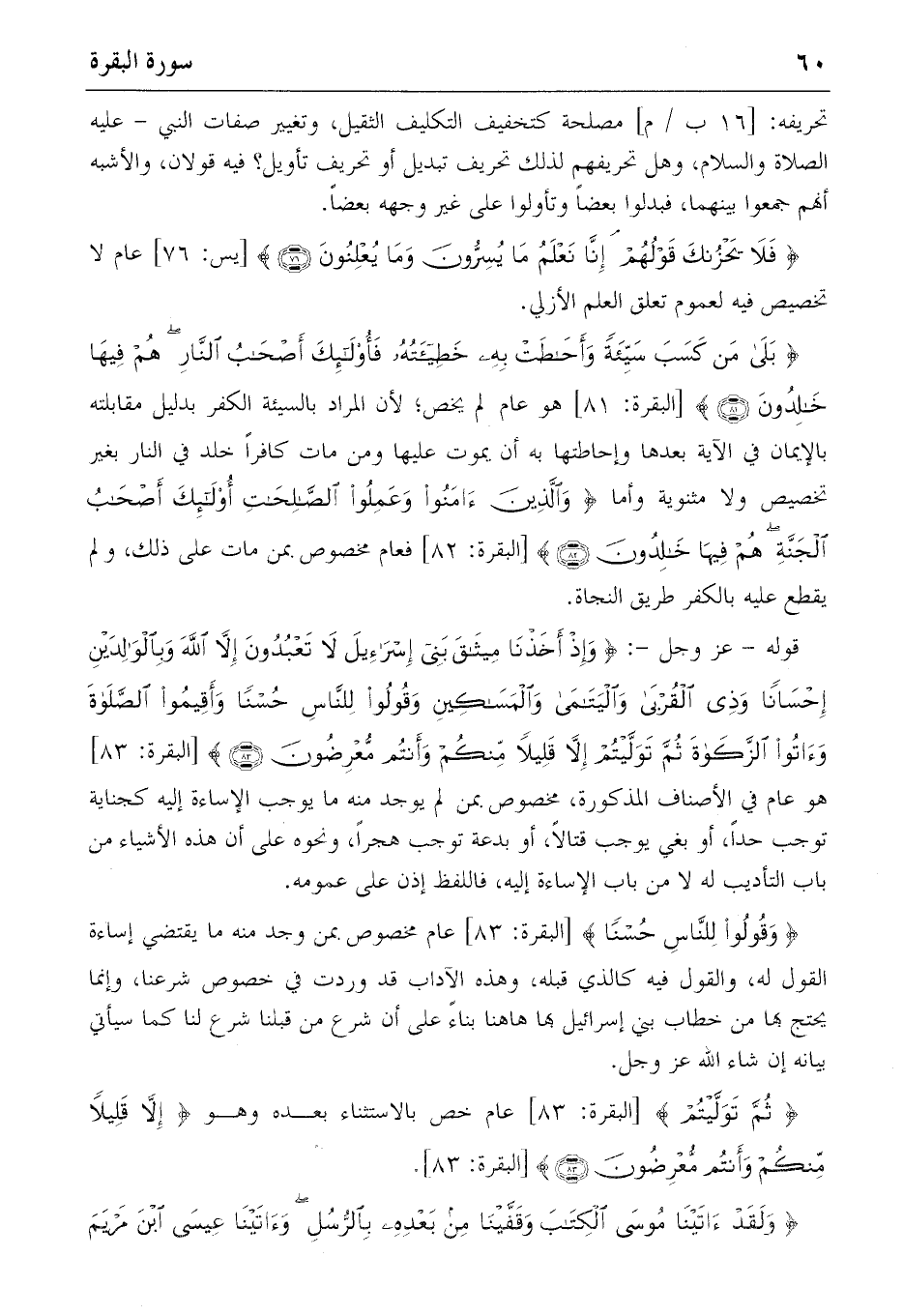 قوله-عز وجل-: {وَإِذْ أَخَذْنا مِيثاقَ بَنِي إِسْرائِيلَ لا تَعْبُدُونَ إِلاَّ اللهَ وَبِالْوالِدَيْنِ إِحْساناً وَذِي الْقُرْبى وَالْيَتامى وَالْمَساكِينِ وَقُولُوا لِلنّاسِ حُسْناً وَأَقِيمُوا الصَّلاةَ وَآتُوا الزَّكاةَ ثُمَّ تَوَلَّيْتُمْ إِلاّ قَلِيلاً مِنْكُمْ وَأَنْتُمْ مُعْرِضُونَ} (83) [البقرة: 83] هو عام في الأصناف المذكورة، مخصوص بمن لم يوجد منه ما يوجب الإساءة إليه كجناية توجب حدا، أو بغي يوجب قتالا، أو بدعة توجب هجرا، ونحوه على أن هذه الأشياء من باب التأديب له لا من باب الإساءة إليه، فاللفظ إذن على عمومه.