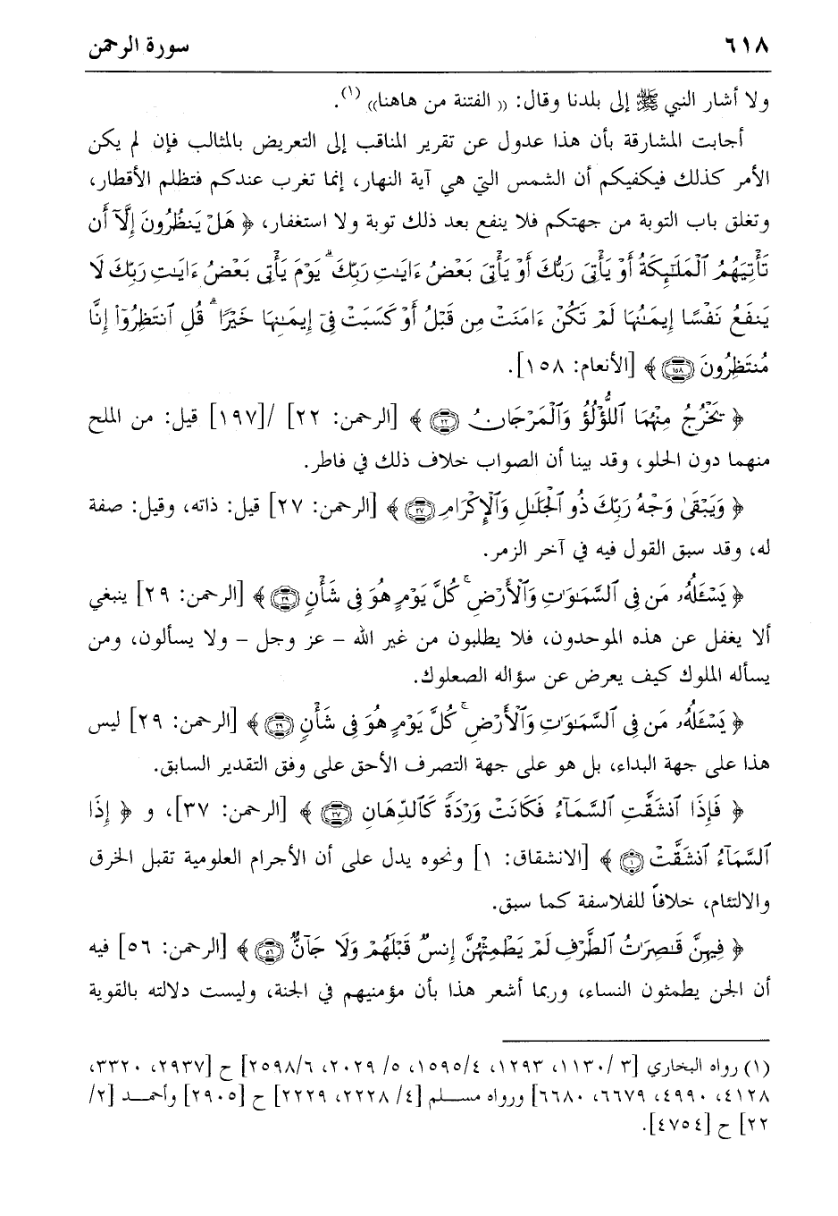 {فَإِذَا اِنْشَقَّتِ السَّماءُ فَكانَتْ وَرْدَةً كَالدِّهانِ} (37) [الرحمن: 37]، و {إِذَا السَّماءُ اِنْشَقَّتْ} (1) [الانشقاق: 1] ونحوه يدل على أن الأجرام العلومية تقبل الخرق والالتئام، خلافا للفلاسفة كما سبق.
