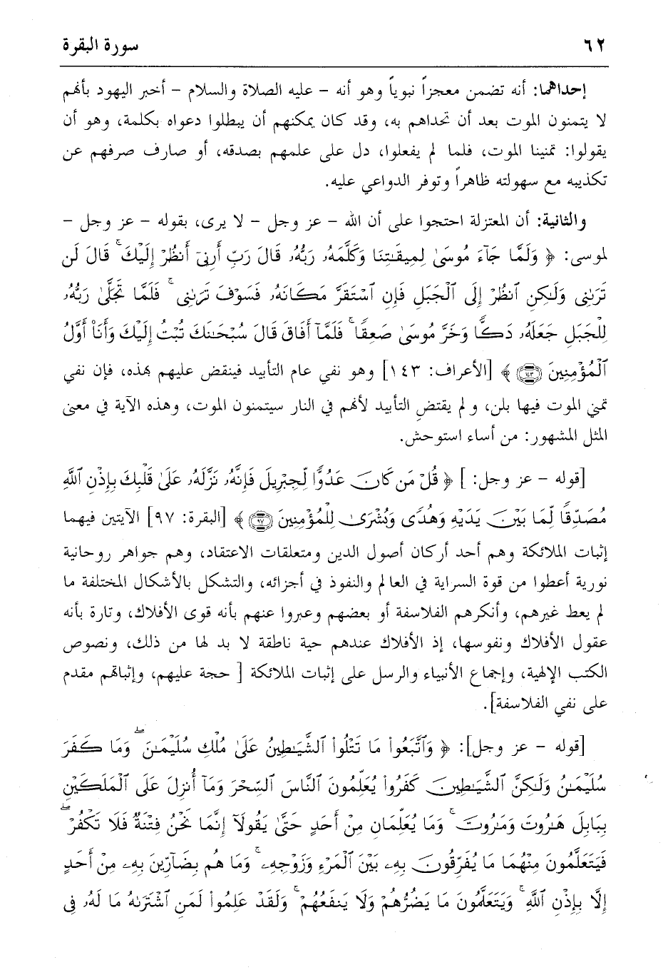 [قوله-عز وجل: ] {قُلْ مَنْ كانَ عَدُوًّا لِجِبْرِيلَ فَإِنَّهُ نَزَّلَهُ عَلى قَلْبِكَ بِإِذْنِ اللهِ مُصَدِّقاً لِما بَيْنَ يَدَيْهِ وَهُدىً وَبُشْرى لِلْمُؤْمِنِينَ} (97) [البقرة: 97] الآيتين فيهما إثبات الملائكة وهم أحد أركان أصول الدين ومتعلقات الاعتقاد، وهم جواهر روحانية نورية أعطوا من قوة السراية في العالم والنفوذ في أجزائه، والتشكل بالأشكال المختلفة ما لم يعط غيرهم، وأنكرهم الفلاسفة أو بعضهم وعبروا عنهم بأنه قوى الأفلاك، وتارة بأنه عقول الأفلاك ونفوسها، إذ الأفلاك عندهم حية ناطقة لا بد لها من ذلك، ونصوص الكتب الإلهية، وإجماع الأنبياء والرسل على إثبات الملائكة [حجة عليهم، وإثباتهم مقدم على نفي الفلاسفة].