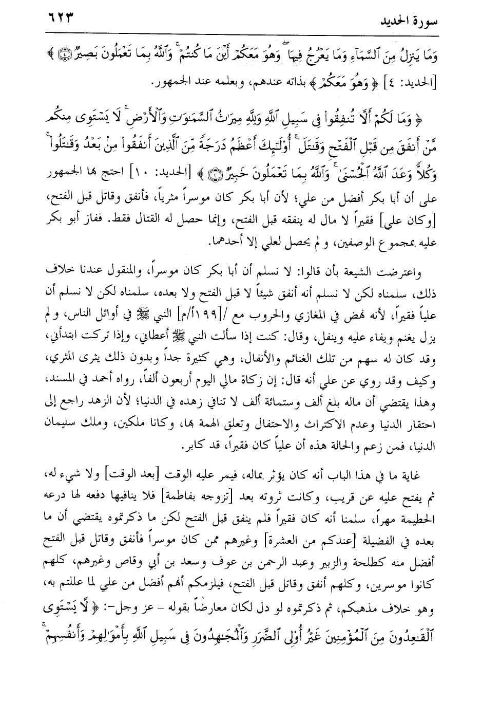 {وَما لَكُمْ أَلاّ تُنْفِقُوا فِي سَبِيلِ اللهِ وَلِلّهِ مِيراثُ السَّماواتِ وَالْأَرْضِ لا يَسْتَوِي مِنْكُمْ مَنْ أَنْفَقَ مِنْ قَبْلِ الْفَتْحِ وَقاتَلَ أُولئِكَ أَعْظَمُ دَرَجَةً مِنَ الَّذِينَ أَنْفَقُوا مِنْ بَعْدُ وَقاتَلُوا وَكُلاًّ وَعَدَ اللهُ الْحُسْنى وَاللهُ بِما تَعْمَلُونَ خَبِيرٌ} (10) [الحديد: 10] احتج بها الجمهور على أن أبا بكر أفضل من علي؛ لأن أبا بكر كان موسرا مثريا، فأنفق وقاتل قبل الفتح، [وكان علي] فقيرا لا مال له ينفقه قبل الفتح، وإنما حصل له القتال فقط. ففاز أبو بكر عليه بمجموع الوصفين، ولم يحصل لعلي إلا أحدهما.