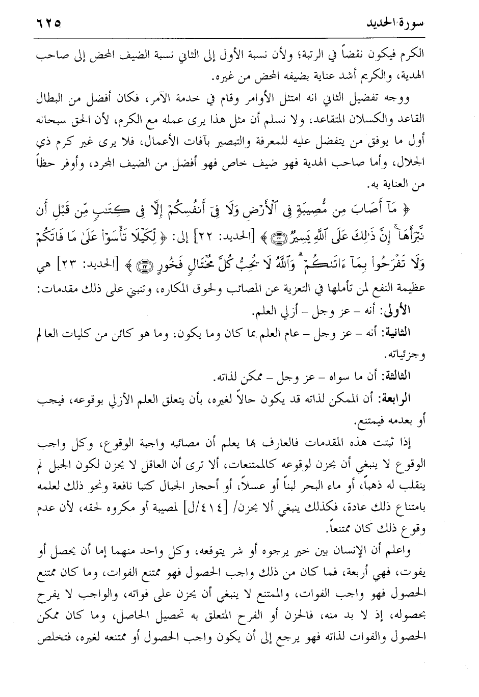 {ما أَصابَ مِنْ مُصِيبَةٍ فِي الْأَرْضِ وَلا فِي أَنْفُسِكُمْ إِلاّ فِي كِتابٍ مِنْ قَبْلِ أَنْ نَبْرَأَها إِنَّ ذلِكَ عَلَى اللهِ يَسِيرٌ} (22) [الحديد: 22] إلى: {لِكَيْلا تَأْسَوْا عَلى ما فاتَكُمْ وَلا تَفْرَحُوا بِما آتاكُمْ وَاللهُ لا يُحِبُّ كُلَّ مُخْتالٍ فَخُورٍ} (23) [الحديد: 23] هي عظيمة النفع لمن تأملها في التعزية عن المصائب ولحوق المكاره، وتنبني على ذلك مقدمات: