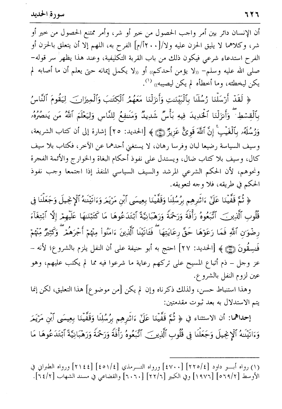 {ثُمَّ قَفَّيْنا عَلى آثارِهِمْ بِرُسُلِنا وَقَفَّيْنا بِعِيسَى اِبْنِ مَرْيَمَ وَآتَيْناهُ الْإِنْجِيلَ وَجَعَلْنا فِي قُلُوبِ الَّذِينَ اِتَّبَعُوهُ رَأْفَةً وَرَحْمَةً وَرَهْبانِيَّةً اِبْتَدَعُوها ما كَتَبْناها عَلَيْهِمْ إِلاَّ اِبْتِغاءَ رِضْوانِ اللهِ فَما رَعَوْها حَقَّ رِعايَتِها فَآتَيْنَا الَّذِينَ آمَنُوا مِنْهُمْ أَجْرَهُمْ وَكَثِيرٌ مِنْهُمْ فاسِقُونَ} (27) [الحديد: 27] احتج به أبو حنيفة على أن النفل يلزم بالشروع؛ لأنه- عز وجل-ذم أتباع المسيح على تركهم رعاية ما شرعوا فيه مما لم يكتب عليهم، وهو عين لزوم النفل بالشروع.