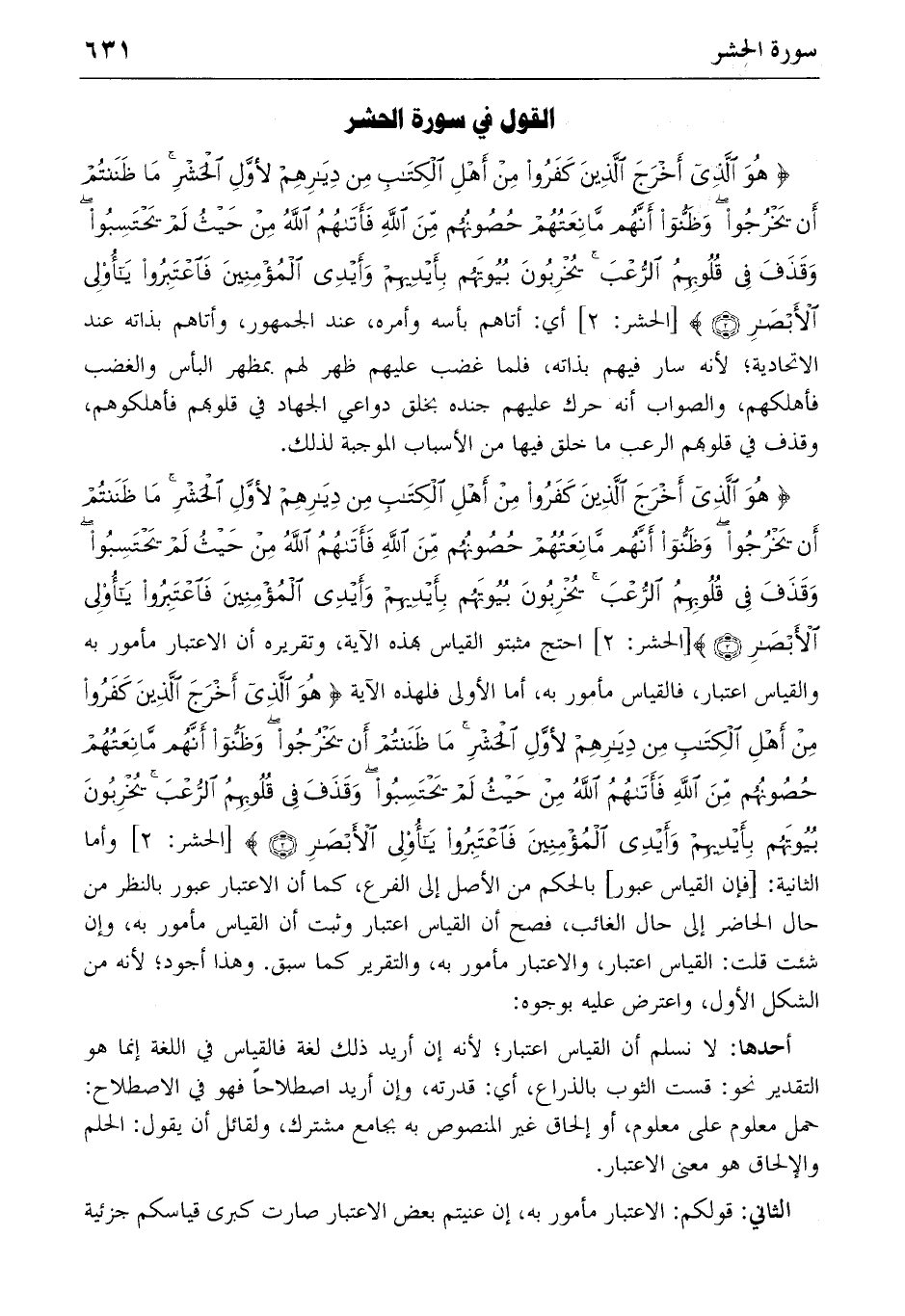 {هُوَ الَّذِي أَخْرَجَ الَّذِينَ كَفَرُوا مِنْ أَهْلِ الْكِتابِ مِنْ دِيارِهِمْ لِأَوَّلِ الْحَشْرِ ما ظَنَنْتُمْ أَنْ يَخْرُجُوا وَظَنُّوا أَنَّهُمْ مانِعَتُهُمْ حُصُونُهُمْ مِنَ اللهِ فَأَتاهُمُ اللهُ مِنْ حَيْثُ لَمْ يَحْتَسِبُوا وَقَذَفَ فِي قُلُوبِهِمُ الرُّعْبَ يُخْرِبُونَ بُيُوتَهُمْ بِأَيْدِيهِمْ وَأَيْدِي الْمُؤْمِنِينَ فَاعْتَبِرُوا يا أُولِي الْأَبْصارِ} (2) [الحشر: 2] احتج مثبتو القياس بهذه الآية، وتقريره أن الاعتبار مأمور به والقياس اعتبار، فالقياس مأمور به، أما الأولى فلهذه الآية {هُوَ الَّذِي أَخْرَجَ الَّذِينَ كَفَرُوا مِنْ أَهْلِ الْكِتابِ مِنْ دِيارِهِمْ لِأَوَّلِ الْحَشْرِ ما ظَنَنْتُمْ أَنْ يَخْرُجُوا وَظَنُّوا أَنَّهُمْ مانِعَتُهُمْ حُصُونُهُمْ مِنَ اللهِ فَأَتاهُمُ اللهُ مِنْ حَيْثُ لَمْ يَحْتَسِبُوا وَقَذَفَ فِي قُلُوبِهِمُ الرُّعْبَ يُخْرِبُونَ بُيُوتَهُمْ بِأَيْدِيهِمْ وَأَيْدِي الْمُؤْمِنِينَ فَاعْتَبِرُوا يا أُولِي الْأَبْصارِ} (2) [الحشر: 2] وأما الثانية: [فإن القياس عبور] بالحكم من الأصل إلى الفرع، كما أن الاعتبار عبور بالنظر من حال الحاضر إلى حال الغائب، فصح أن القياس اعتبار وثبت أن القياس مأمور به، وإن شئت قلت: القياس اعتبار، والاعتبار مأمور به، والتقرير كما سبق. وهذا أجود؛ لأنه من الشكل الأول، واعترض عليه بوجوه:
