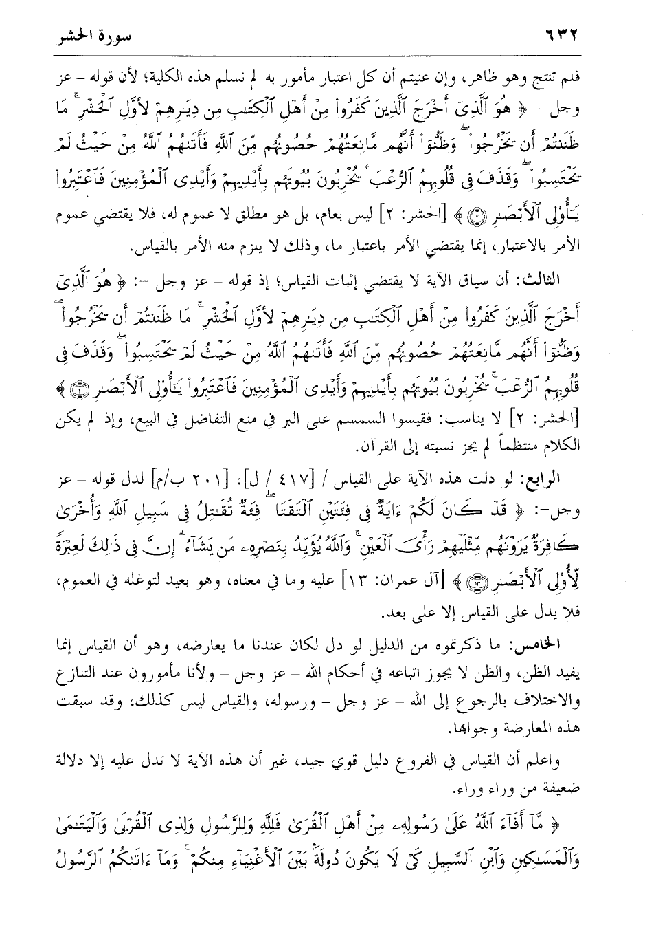 الثالث: أن سياق الآية لا يقتضي إثبات القياس؛ إذ قوله-عز وجل-: {هُوَ الَّذِي أَخْرَجَ الَّذِينَ كَفَرُوا مِنْ أَهْلِ الْكِتابِ مِنْ دِيارِهِمْ لِأَوَّلِ الْحَشْرِ ما ظَنَنْتُمْ أَنْ يَخْرُجُوا وَظَنُّوا أَنَّهُمْ مانِعَتُهُمْ حُصُونُهُمْ مِنَ اللهِ فَأَتاهُمُ اللهُ مِنْ حَيْثُ لَمْ يَحْتَسِبُوا وَقَذَفَ فِي قُلُوبِهِمُ الرُّعْبَ يُخْرِبُونَ بُيُوتَهُمْ بِأَيْدِيهِمْ وَأَيْدِي الْمُؤْمِنِينَ فَاعْتَبِرُوا يا أُولِي الْأَبْصارِ} (2) [الحشر: 2] لا يناسب: فقيسوا السمسم على البر في منع التفاضل في البيع، وإذ لم يكن الكلام منتظما لم يجز نسبته إلى القرآن.