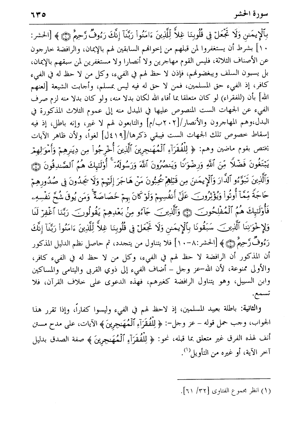 والثانية: باطلة بعبيد المسلمين، إذ لاحظ لهم في الفيء وليسوا كفارا، وإذا تقرر هذا الجواب، وجب حمل قوله-عز وجل-: {لِلْفُقَراءِ الْمُهاجِرِينَ} الآيات، على مدح مستن أنف لهذه الفرق غير متعلق بما قبله، نحو: {لِلْفُقَراءِ الْمُهاجِرِينَ} صفة الصدق بدليل آخر الآية، أو غيره من التأويل (1).