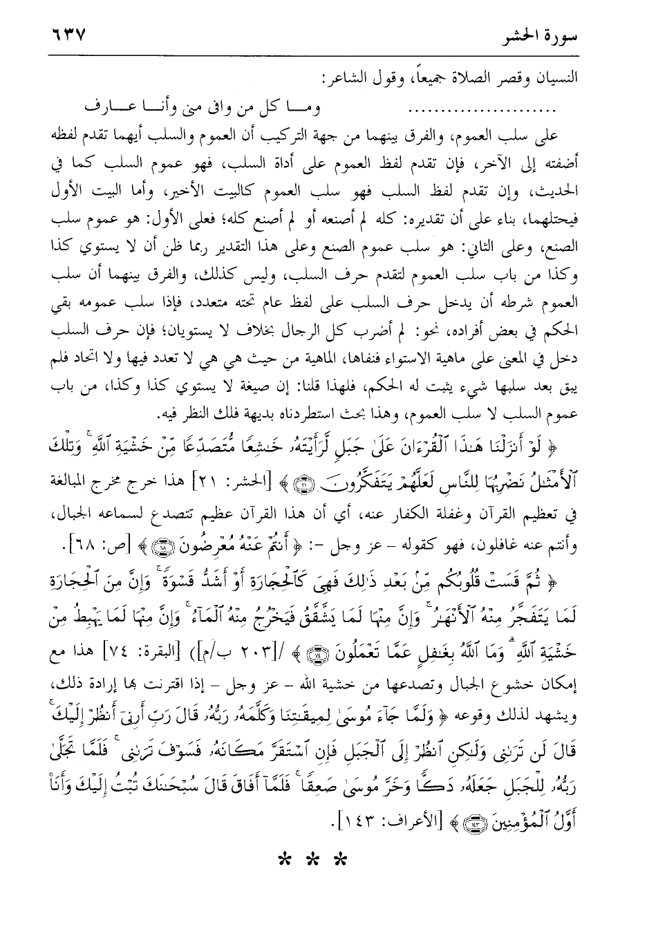 {ثُمَّ قَسَتْ قُلُوبُكُمْ مِنْ بَعْدِ ذلِكَ فَهِيَ كَالْحِجارَةِ أَوْ أَشَدُّ قَسْوَةً وَإِنَّ مِنَ الْحِجارَةِ لَما يَتَفَجَّرُ مِنْهُ الْأَنْهارُ وَإِنَّ مِنْها لَما يَشَّقَّقُ فَيَخْرُجُ مِنْهُ الْماءُ وَإِنَّ مِنْها لَما يَهْبِطُ مِنْ خَشْيَةِ اللهِ وَمَا اللهُ بِغافِلٍ عَمّا تَعْمَلُونَ} (74) / [203 ب/م]) [البقرة: 74] هذا مع إمكان خشوع الجبال وتصدعها من خشية الله-عز وجل-إذا اقترنت بها إرادة ذلك، ويشهد لذلك وقوعه {وَلَمّا جاءَ مُوسى لِمِيقاتِنا وَكَلَّمَهُ رَبُّهُ قالَ رَبِّ أَرِنِي أَنْظُرْ إِلَيْكَ قالَ لَنْ تَرانِي وَلكِنِ اُنْظُرْ إِلَى الْجَبَلِ فَإِنِ اِسْتَقَرَّ مَكانَهُ فَسَوْفَ تَرانِي فَلَمّا تَجَلّى رَبُّهُ لِلْجَبَلِ جَعَلَهُ دَكًّا وَخَرَّ مُوسى صَعِقاً فَلَمّا أَفاقَ قالَ سُبْحانَكَ تُبْتُ إِلَيْكَ وَأَنَا أَوَّلُ الْمُؤْمِنِينَ} (143) [الأعراف: 143].