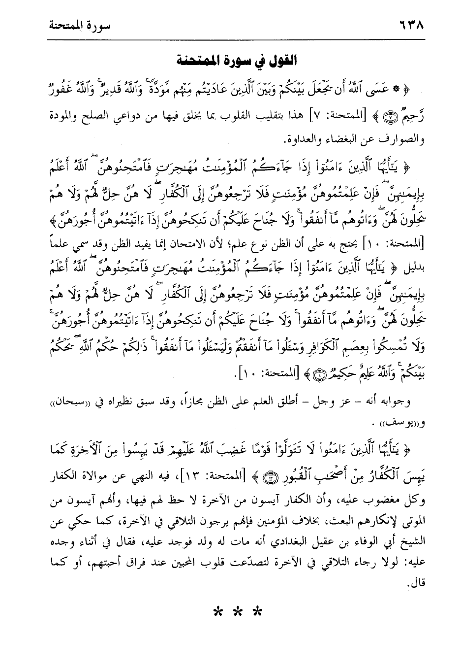{يا أَيُّهَا الَّذِينَ آمَنُوا لا تَتَوَلَّوْا قَوْماً غَضِبَ اللهُ عَلَيْهِمْ قَدْ يَئِسُوا مِنَ الْآخِرَةِ كَما يَئِسَ الْكُفّارُ مِنْ أَصْحابِ الْقُبُورِ} (13) [الممتحنة: 13]، فيه النهي عن موالاة الكفار وكل مغضوب عليه، وأن الكفار آيسون من الآخرة لا حظ لهم فيها، وأنهم آيسون من الموتى لإنكارهم البعث، بخلاف المؤمنين فإنهم يرجون التلاقي في الآخرة، كما حكي عن الشيخ أبي الوفاء بن عقيل البغدادي أنه مات له ولد فوجد عليه، فقال في أثناء وجده عليه: لولا رجاء التلاقي في الآخرة لتصدّعت قلوب المحبين عند فراق أحبتهم، أو كما قال.