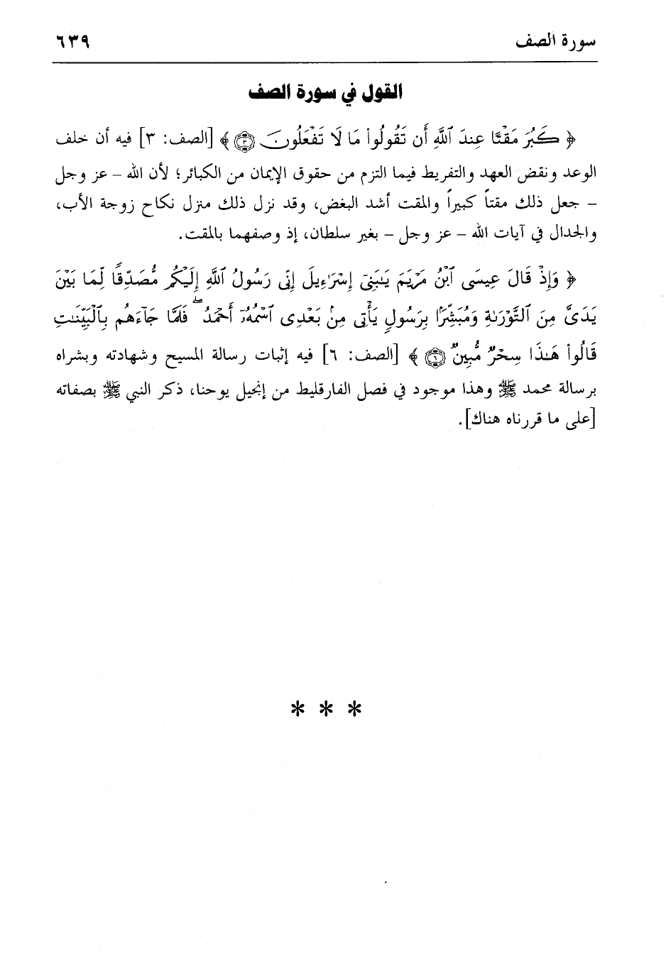 {وَإِذْ قالَ عِيسَى اِبْنُ مَرْيَمَ يا بَنِي إِسْرائِيلَ إِنِّي رَسُولُ اللهِ إِلَيْكُمْ مُصَدِّقاً لِما بَيْنَ يَدَيَّ مِنَ التَّوْراةِ وَمُبَشِّراً بِرَسُولٍ يَأْتِي مِنْ بَعْدِي اِسْمُهُ أَحْمَدُ فَلَمّا جاءَهُمْ بِالْبَيِّناتِ قالُوا هذا سِحْرٌ مُبِينٌ} (6) [الصف: 6] فيه إثبات رسالة المسيح وشهادته وبشراه برسالة محمد صلّى الله عليه وسلّم وهذا موجود في فصل الفارقليط من إنجيل يوحنا، ذكر النبي صلّى الله عليه وسلّم بصفاته [على ما قررناه هناك].