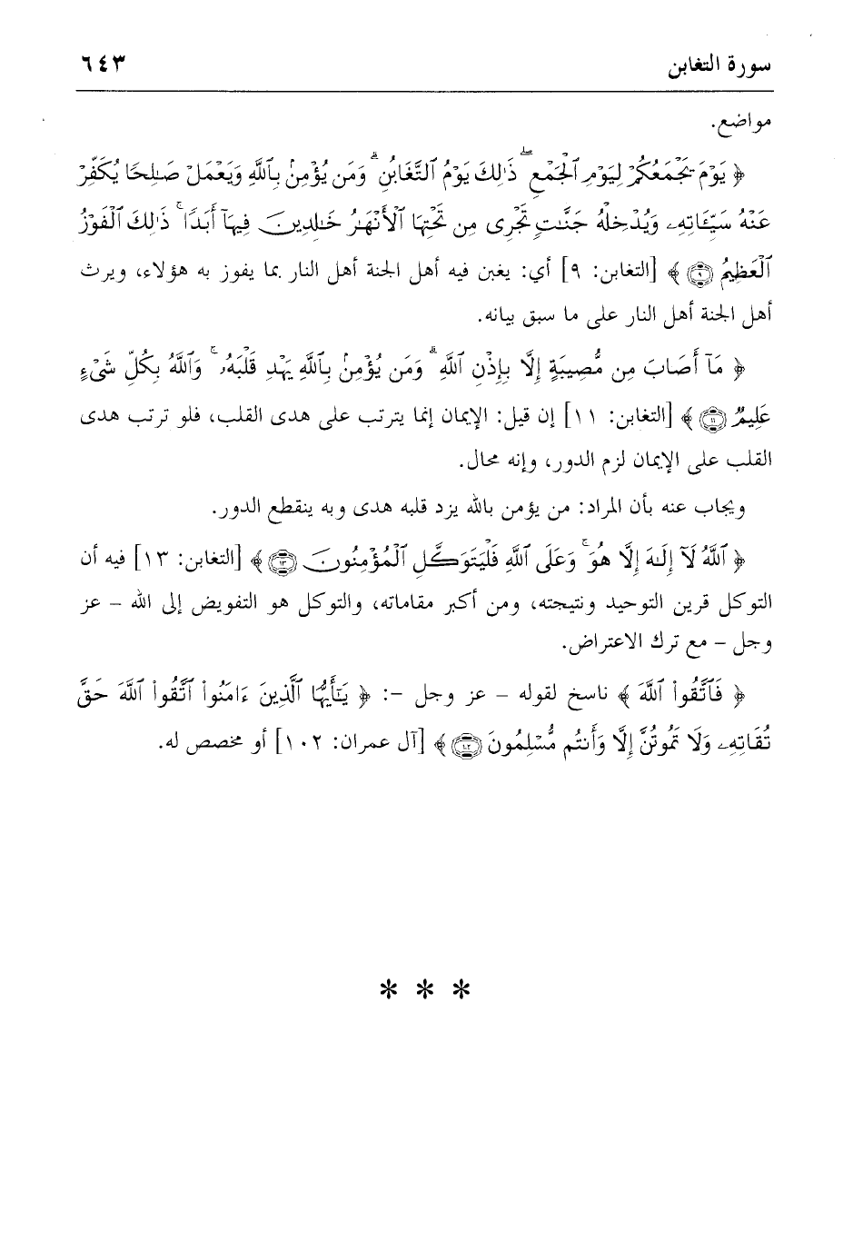 {اللهُ لا إِلهَ إِلاّ هُوَ وَعَلَى اللهِ فَلْيَتَوَكَّلِ الْمُؤْمِنُونَ} (13) [التغابن: 13] فيه أن التوكل قرين التوحيد ونتيجته، ومن أكبر مقاماته، والتوكل هو التفويض إلى الله-عز وجل-مع ترك الاعتراض.