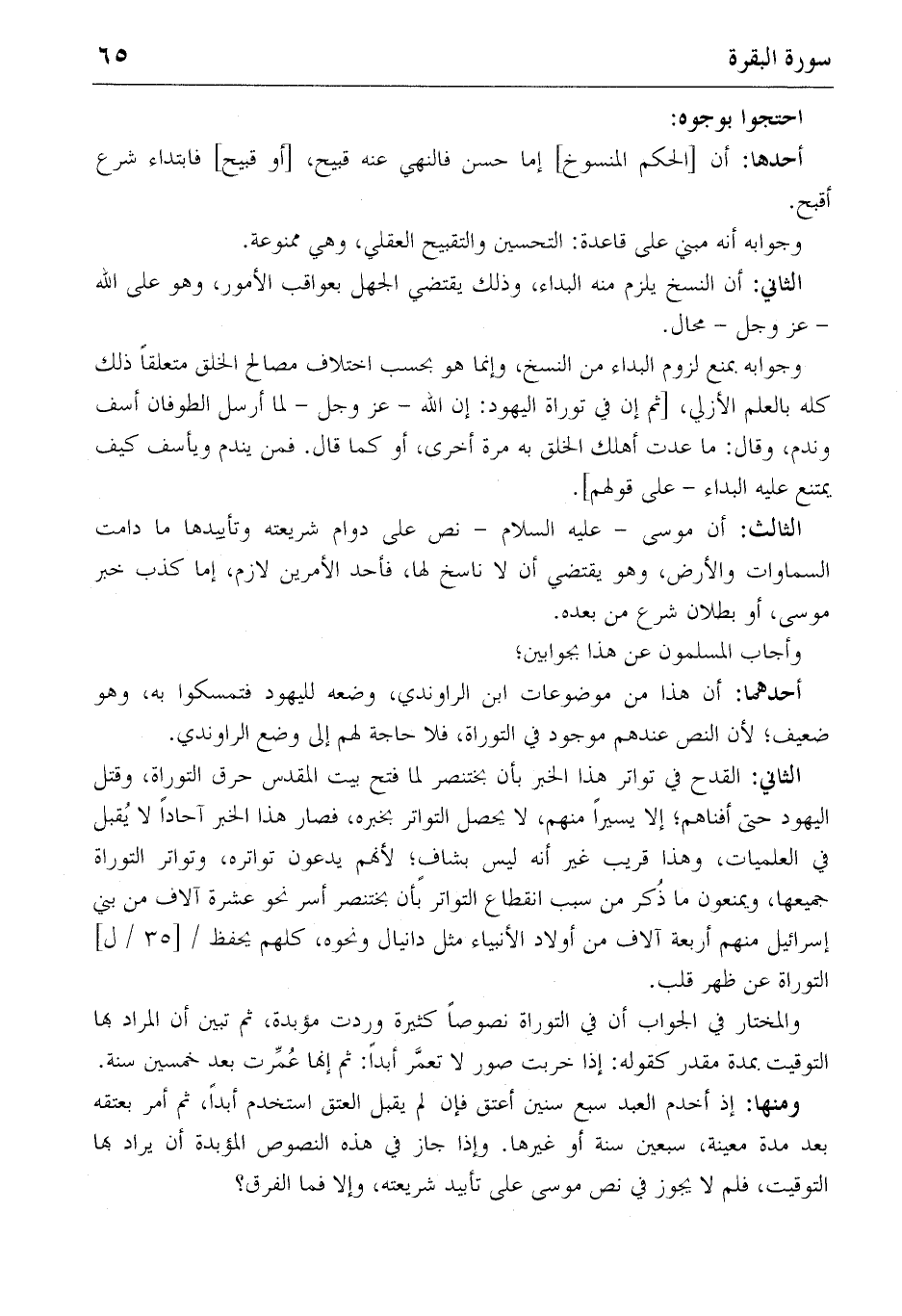 وجوابه بمنع لزوم البداء من النسخ، وإنما هو بحسب اختلاف مصالح الخلق متعلقا ذلك كله بالعلم الأزلي، [ثم إن في توراة اليهود: إن الله-عز وجل-لما أرسل الطوفان أسف وندم، وقال: ما عدت أهلك الخلق به مرة أخرى، أو كما قال. فمن يندم ويأسف كيف يمتنع عليه البداء-على قولهم].