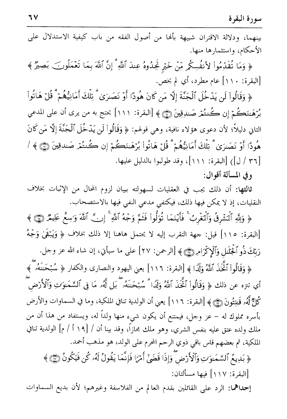 {وَقالُوا اِتَّخَذَ اللهُ وَلَداً} [البقرة: 116] يعني اليهود والنصارى والكفار {سُبْحانَهُ} أي تنزه عن ذلك {وَقالُوا اِتَّخَذَ اللهُ وَلَداً سُبْحانَهُ بَلْ لَهُ ما فِي السَّماواتِ وَالْأَرْضِ كُلٌّ لَهُ قانِتُونَ} (116) [البقرة: 116] يعني أن الولدية تنافي الملكية، وما في السماوات والأرض بأسره مملوك له-عز وجل، فيمتنع أن يكون شيء منها ولدا له، ويستفاد من هذا أن من ملك ولده عتق عليه بنفس الشري، وهو ملك مجازا، وقد بينا أن/ [19 أ/م] الولدية تنافي الملكية، ثم بعضهم قاس باقي ذوي الرحم المحرم على الولد، هو مذهب أحمد.