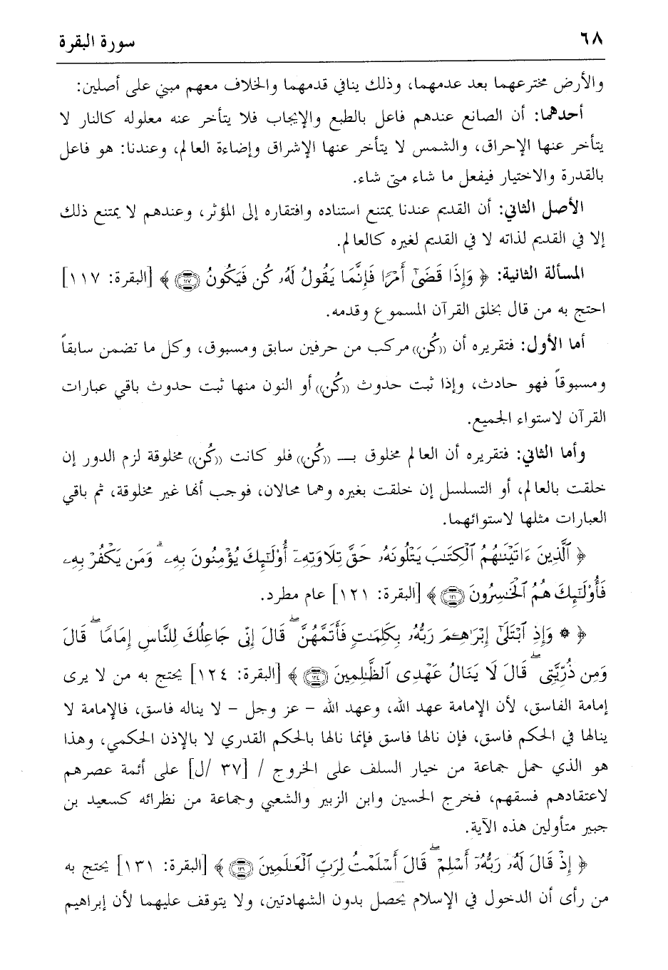 {* وَإِذِ اِبْتَلى إِبْراهِيمَ رَبُّهُ بِكَلِماتٍ فَأَتَمَّهُنَّ قالَ إِنِّي جاعِلُكَ لِلنّاسِ إِماماً قالَ وَمِنْ ذُرِّيَّتِي قالَ لا يَنالُ عَهْدِي الظّالِمِينَ} (124) [البقرة: 124] يحتج به من لا يرى إمامة الفاسق، لأن الإمامة عهد الله، وعهد الله-عز وجل-لا يناله فاسق، فالإمامة لا ينالها في الحكم فاسق، فإن نالها فاسق فإنما نالها بالحكم القدري لا بالإذن الحكمي، وهذا هو الذي حمل جماعة من خيار السلف على الخروج/ [37/ل] على أئمة عصرهم لاعتقادهم فسقهم، فخرج الحسين وابن الزبير والشعبي وجماعة من نظرائه كسعيد بن جبير متأولين هذه الآية.