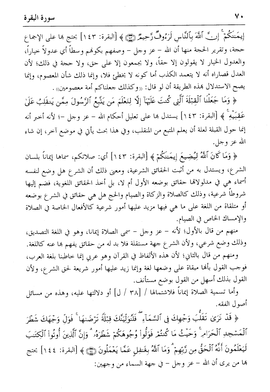 {إِيمانَكُمْ إِنَّ اللهَ بِالنّاسِ لَرَؤُفٌ رَحِيمٌ} (143) [البقرة: 143] يحتج بها على الإجماع حجة، وتقرير الحجة منها أن الله-عز وجل-وصفهم بكونهم وسطا أي عدولا خيارا، والعدول الخيار لا يقولون إلا حقا، ولا يجمعون إلا على حق، ولا حجة في ذلك؛ لأن العدل قصاراه أنه لا يتعمد الكذب أما كونه لا يخطئ فلا، وإنما ذلك شأن المعصوم، وإنما يصح الاستدلال بهذه الطريقة أن لو قال: «وكذلك جعلناكم أمة معصومين».