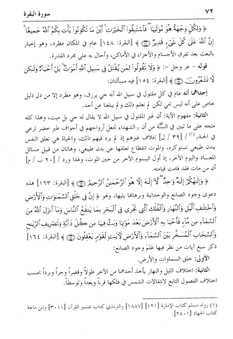 الثانية: مفهوم الآية: أن غير المقتول في سبيل الله لا يقال له حي بل ميت، وهذا كله متجه على ما تبين في السّنّة من أن «الشهداء تجعل أرواحهم في أجواف طير خضر ترعى في الجنة» (1) / [39/ل] بخلاف غيرهم إذ لم يرد فيهم ذلك، والحياة هي تعلق النفس ببدن طبيعي تستوكره، والموت انقطاع تعلقها عن بدن طبيعي، وهاتان من قبيل مسائل المعاد واليوم الآخر، إذ أول اليوم الآخر من حين الموت، ولهذا ورد/ [20 ب/م] أن من مات فقد قامت قيامته.