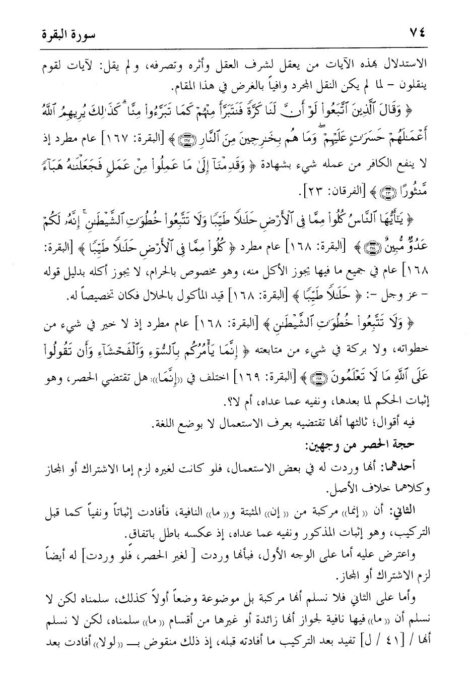 {وَلا تَتَّبِعُوا خُطُواتِ الشَّيْطانِ} [البقرة: 168] عام مطرد إذ لا خير في شيء من خطواته، ولا بركة في شيء من متابعته {إِنَّما يَأْمُرُكُمْ بِالسُّوءِ وَالْفَحْشاءِ وَأَنْ تَقُولُوا عَلَى اللهِ ما لا تَعْلَمُونَ} (169) [البقرة: 169] اختلف في «إنّما»: هل تقتضي الحصر، وهو إثبات الحكم لما بعدها، ونفيه عما عداه، أم لا؟ .
