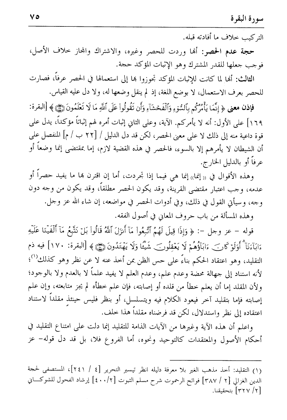 قوله-عز وجل-: {وَإِذا قِيلَ لَهُمُ اِتَّبِعُوا ما أَنْزَلَ اللهُ قالُوا بَلْ نَتَّبِعُ ما أَلْفَيْنا عَلَيْهِ آباءَنا أَوَلَوْ كانَ آباؤُهُمْ لا يَعْقِلُونَ شَيْئاً وَلا يَهْتَدُونَ} (170) [البقرة: 170] فيه ذم التقليد، وهو اعتقاد الحكم بناء على حس الظن بمن أخذ عنه لا عن نظر وهو كذلك (1)؛ لأنه استناد إلى جهالة محضة وعدم علم، وعدم العلم لا يفيد علما لا بالعدم ولا بالوجود؛ ولأن المقلد إما أن يعلم خطأ من قلده أو إصابته، فإن علم خطأه لم يجز متابعته، وإن علم إصابته فإما بتقليد آخر فيعود الكلام فيه ويتسلسل، أو بنظر فليس حينئذ مقلدا لاستناد اعتقاده إلى نظر واستدلال، لكن قد فرضناه مقلدا هذا خلف.