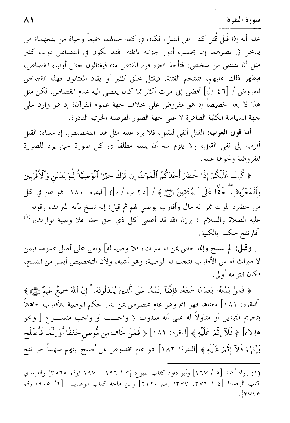 {كُتِبَ عَلَيْكُمْ إِذا حَضَرَ أَحَدَكُمُ الْمَوْتُ إِنْ تَرَكَ خَيْراً الْوَصِيَّةُ لِلْوالِدَيْنِ وَالْأَقْرَبِينَ بِالْمَعْرُوفِ حَقًّا عَلَى الْمُتَّقِينَ} (180) / [25 ب/م]) [البقرة: 180] هو عام في كل من حضره الموت ممن له مال وأقارب يوصي لهم ثم قيل: إنه نسخ بآية الميراث، وقوله- عليه الصلاة والسّلام-: «إن الله قد أعطى كل ذي حق حقه فلا وصية لوارث» (1) [فارتفع حكمه بالكلية.