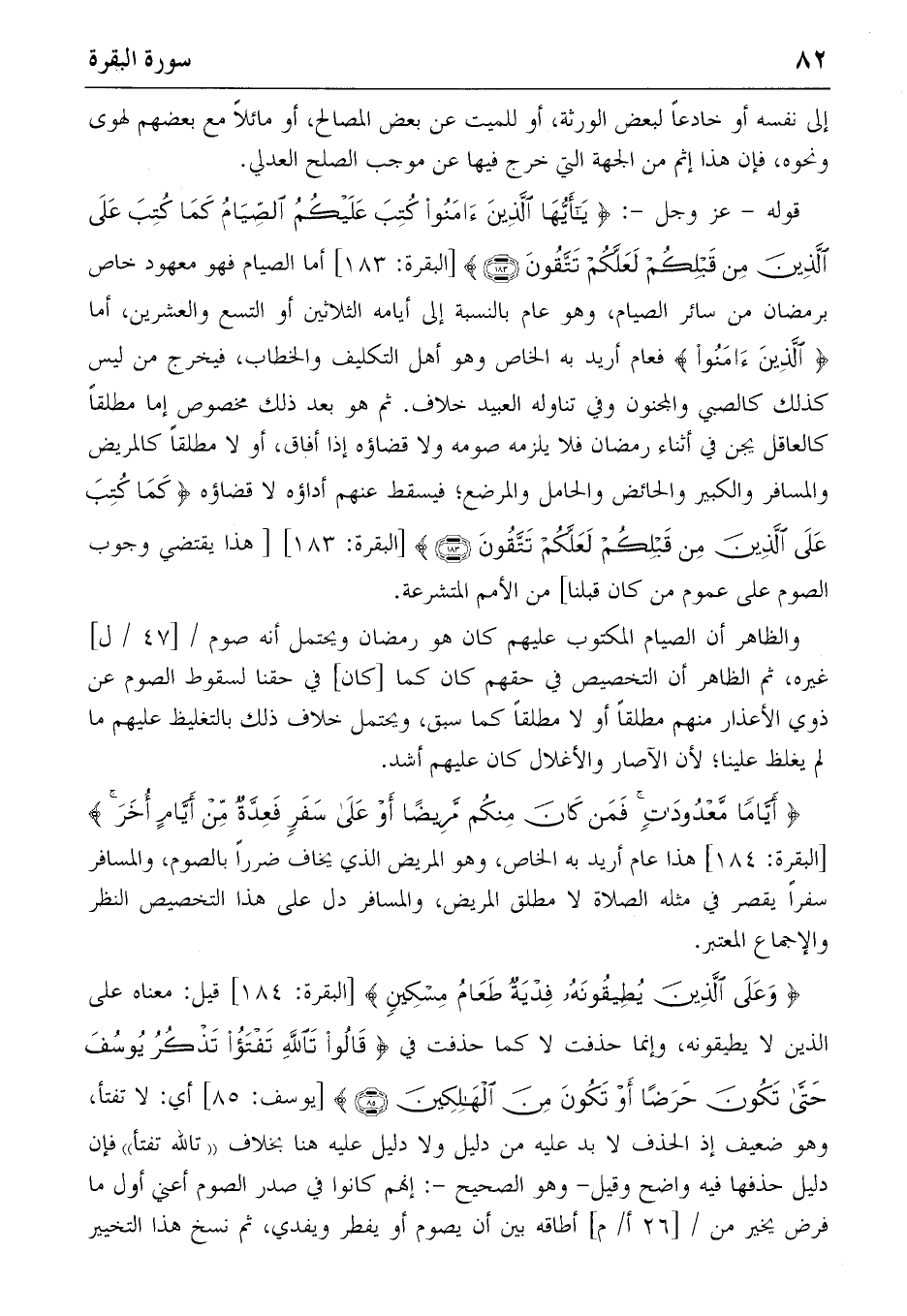 قوله-عز وجل-: {يا أَيُّهَا الَّذِينَ آمَنُوا كُتِبَ عَلَيْكُمُ الصِّيامُ كَما كُتِبَ عَلَى الَّذِينَ مِنْ قَبْلِكُمْ لَعَلَّكُمْ تَتَّقُونَ} (183) [البقرة: 183] أما الصيام فهو معهود خاص برمضان من سائر الصيام، وهو عام بالنسبة إلى أيامه الثلاثين أو التسع والعشرين، أما {الَّذِينَ آمَنُوا} فعام أريد به الخاص وهو أهل التكليف والخطاب، فيخرج من ليس كذلك كالصبي والمجنون وفي تناوله العبيد خلاف. ثم هو بعد ذلك مخصوص إما مطلقا كالعاقل يجن في أثناء رمضان فلا يلزمه صومه ولا قضاؤه إذا أفاق، أو لا مطلقا كالمريض والمسافر والكبير والحائض والحامل والمرضع؛ فيسقط عنهم أداؤه لا قضاؤه {كَما كُتِبَ عَلَى الَّذِينَ مِنْ قَبْلِكُمْ لَعَلَّكُمْ تَتَّقُونَ} (183) [البقرة: 183] [هذا يقتضي وجوب الصوم على عموم من كان قبلنا] من الأمم المتشرعة.