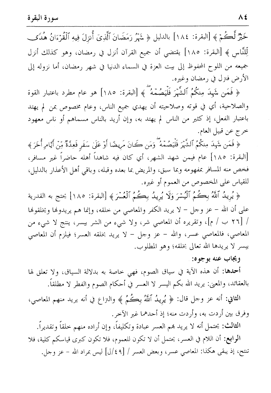 {يُرِيدُ اللهُ بِكُمُ الْيُسْرَ وَلا يُرِيدُ بِكُمُ الْعُسْرَ} [البقرة: 185] يحتج به القدرية على أن الله-عز وجل-لا يريد الكفر والمعاصي من خلقه، وإنما هم يريدونها ويخلقونها / [26 ب/م]، وتقريره أن المعاصي شر، ولا شيء من الشر بيسر، ينتج لا شيء من المعاصي، فالمعاصي عسر، والله-عز وجل-لا يريد بخلقه العسر؛ فيلزم أن المعاصي بيسر لا يريدها الله تعالى بخلقه؛ وهو المطلوب.