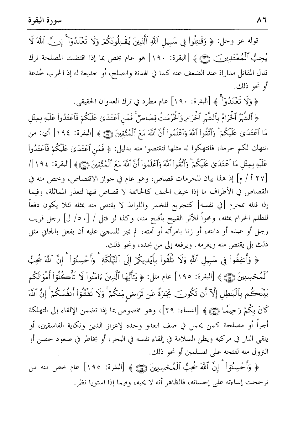 قوله عز وجل: {وَقاتِلُوا فِي سَبِيلِ اللهِ الَّذِينَ يُقاتِلُونَكُمْ وَلا تَعْتَدُوا إِنَّ اللهَ لا يُحِبُّ الْمُعْتَدِينَ} (190) [البقرة: 190] هو عام يخص بما إذا اقتضت المصلحة ترك قتال المقاتل مداراة عند الضعف عنه كما في الهدنة والصلح، أو خديعة له إذ الحرب خدعة أو نحو ذلك.
