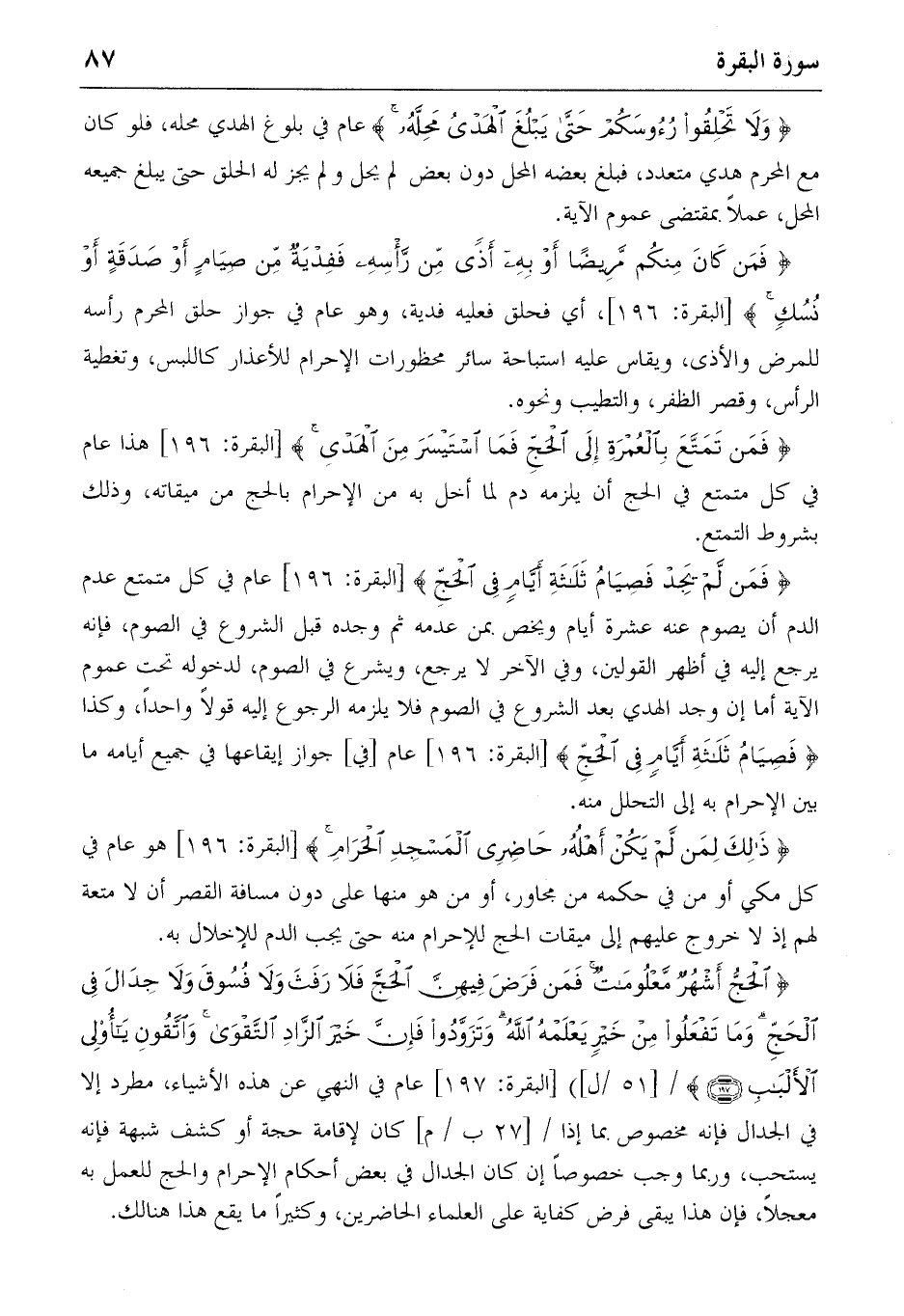 {الْحَجُّ أَشْهُرٌ مَعْلُوماتٌ فَمَنْ فَرَضَ فِيهِنَّ الْحَجَّ فَلا رَفَثَ وَلا فُسُوقَ وَلا جِدالَ فِي الْحَجِّ وَما تَفْعَلُوا مِنْ خَيْرٍ يَعْلَمْهُ اللهُ وَتَزَوَّدُوا فَإِنَّ خَيْرَ الزّادِ التَّقْوى وَاِتَّقُونِ يا أُولِي الْأَلْبابِ} (197) / [51/ل]) [البقرة: 197] عام في النهي عن هذه الأشياء، مطرد إلا في الجدال فإنه مخصوص بما إذا/ [27 ب/م] كان لإقامة حجة أو كشف شبهة فإنه يستحب، وربما وجب خصوصا إن كان الجدال في بعض أحكام الإحرام والحج للعمل به معجلا، فإن هذا يبقى فرض كفاية على العلماء الحاضرين، وكثيرا ما يقع هذا هنالك.
