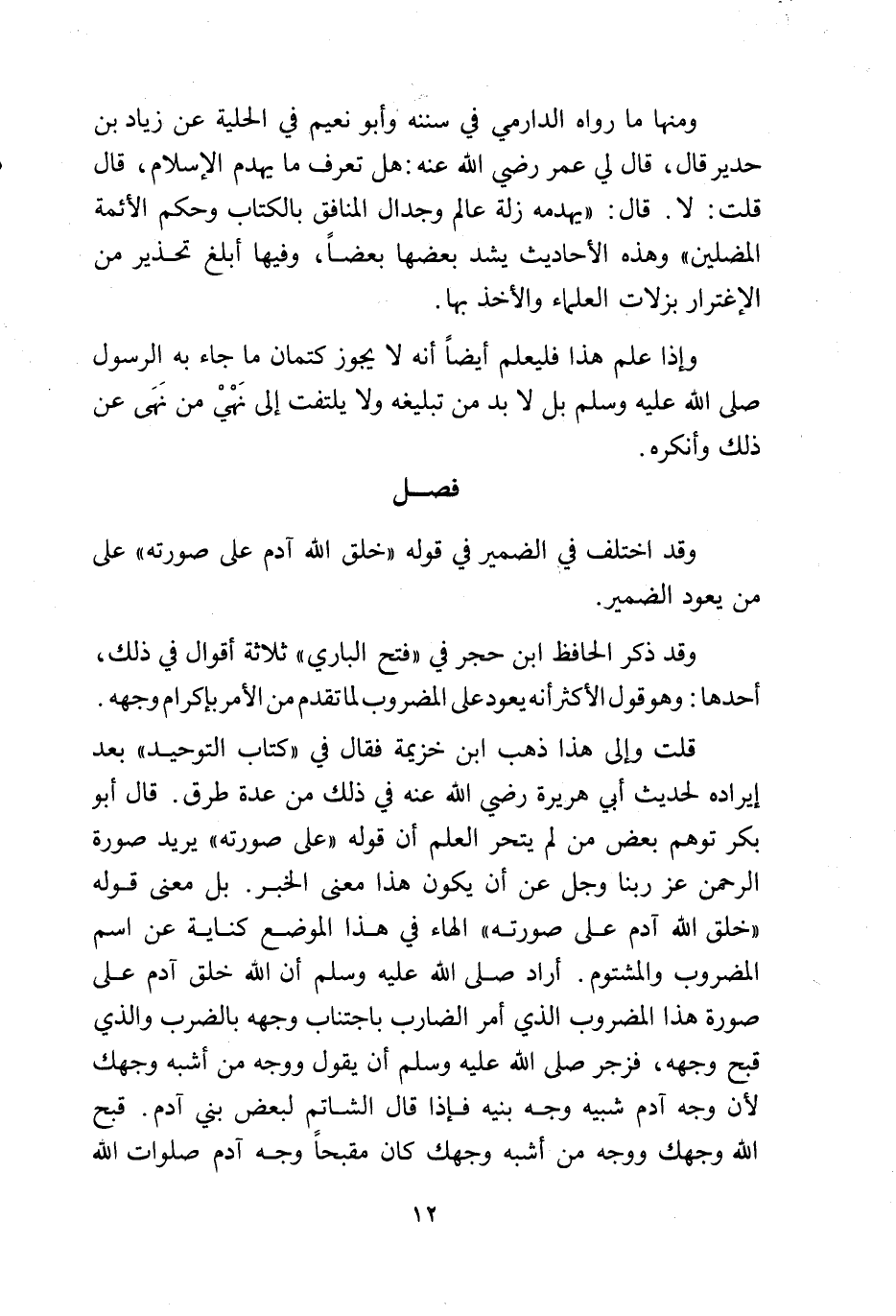 قلت وإلى هذا ذهب ابن خزيمة فقال في «كتاب التوحيد» بعد إيراده لحديث أبي هريرة رضي الله عنه في ذلك من عدة طرق. قال أبو بكر توهم بعض من لم يتحر العلم أن قوله «على صورته» يريد صورة الرحمن عز ربنا وجل عن أن يكون هذا معنى الخبر. بل معنى قوله «خلق الله آدم على صورته» الهاء في هذا الموضع كناية عن اسم المضروب والمشتوم. أراد صلى الله عليه وسلم أن الله خلق آدم على صورة هذا المضروب الذي أمر الضارب باجتناب وجهه بالضرب والذي قبح وجهه، فزجر صلى الله عليه وسلم أن يقول ووجه من أشبه وجهك لأن وجه آدم شبيه وجه بنيه فإذا قال الشاتم لبعض بني آدم. قبح الله وجهك ووجه من أشبه وجهك كان مقبحاً وجه آدم صلوات الله