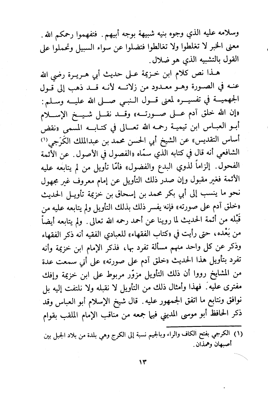 هذا نص كلام ابن خزيمة على حديث أبي هريرة رضي الله عنه في الصورة وهو معدود من زلاته لأنه قد ذهب إلى قول الجهمية في تفسيره لمعنى قول النبي صلى الله عليه وسلم: «إن الله خلق آدم على صورته» وقد نقل شيخ الإسلام أبو العباس ابن تيمية رحمه الله تعالى في كتابه المسمى «نقض أساس التقديس» عن الشيخ أبي الحسن محمد بن عبد الملك الكرجي (¬1) الشافعي أنه قال في كتابه الذي سماه «الفصول في الأصول عن الأئمة الفحول إلزاماً لذوي البدع والفضول» فأما تأويل من لم يتابعه عليه الأئمة فغير مقبول وإن صدر ذلك التأويل عن إمام معروف غير مجهول نحو ما ينسب إلى أبي بكر محمد بن إسحاق بن خزيمة تأويل الحديث «خلق آدم على صورته» فإنه يفسر ذلك بذلك التأويل ولم يتابعه عليه من قبله من أئمة الحديث لما روينا عن أحمد رحمه الله تعالى. ولم يتابعه أيضاً من بعده، حتى رأيت في «كتاب الفقهاء» للعبادي الفقيه أنه ذكر الفقهاء وذكر عن كل واحد منهم مسألة تفرد بها، فذكر الإمام ابن خزيمة وأنه تفرد بتأويل هذا الحديث «خلق آدم على صورته» على أني سمعت عدة من المشايخ رووا أن ذلك التأويل مزور مربوط على ابن خزيمة وإفك مفترى عليه. فهذا وأمثال ذلك من التأويل لا نقبله ولا نلتفت إليه بل نوافق ونتابع ما اتفق الجمهور عليه. قال شيخ الإسلام أبو العباس وقد ذكر الحافظ أبو موسى المديني فيما جمعه من مناقب الإمام الملقب بقوام
