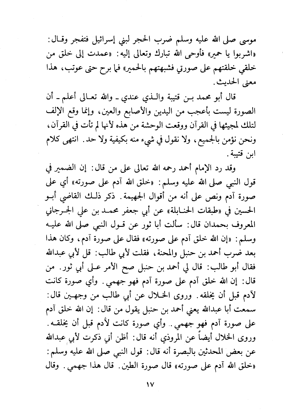وقد رد الإمام أحمد رحمه الله تعالى على من قال: إن الضمير في قول النبي صلى الله عليه وسلم: «خلق الله آدم على صورته» أي على صورة آدم ونص على أنه من أقوال الجهمية. ذكر ذلك القاضي أبو الحسين في «طبقات الحنابلة» عن أبي جعفر محمد بن علي الجرجاني المعروف بحمدان قال: سألت أبا ثور عن قول النبي صلى الله عليه وسلم: «إن الله خلق آدم على صورته» فقال على صورة آدم، وكان هذا بعد ضرب أحمد بن حنبل والمحنة، فقلت لأبي طالب: قل لأبي عبد الله فقال أبو طالب: قال لي أحمد بن حنبل صح الأمر على أبي ثور. من قال: إن الله خلق آدم على صورة آدم فهو جهمي. وأي صورة كان لآدم قبل أن يخلقه. وروى الخلال عن أبي طالب من وجهين قال: سمعت أبا عبد الله يعني أحمد بن حنبل يقول من قال: إن الله خلق آدم على صورة آدم فهو جهمي .. وأي صورة كانت لآدم قبل أن يخلقه. وروى الخلال أيضاً عن المروذي أنه قال: أظن أني ذكرت لأبي عبد الله عن بعض المحدثين بالبصرة أنه قال: قول النبي صلى الله عليه وسلم: «خلق الله آدم على صورته» قال صورة الطين: قال هذا جهمي. وقال