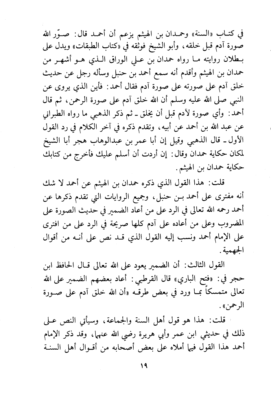 في كتاب «السنة» وحمدان بن الهيثم يزعم أن أحمد قال: صور الله صورة آدم قبل خلقه، وأبو الشيخ فوثقه في «كتاب الطبقات» ويدل على بطلان روايته ما رواه حمدان بن علي الوراق الذي هو أشهر من حمدان بن الهيثم وأقدم أنه سمع أحمد بن حنبل وسأله رجل عن حديث خلق آدم على صورته على صورة آدم فقال أحمد: فأين الذي يروى عن النبي صلى الله عليه وسلم أن الله خلق آدم على صورة الرحمن، ثم قال أحمد: وأي صورة لآدم قبل أن يخلق - ثم ذكر الذهبي ما رواه الطبراني عن عبد الله بن أحمد عن أبيه، وتقدم ذكره في آخر الكلام في رد القول الأول - قال الذهبي وقيل إن أبا عمر بن عبد الوهاب هجر أبا الشيخ لمكان حكاية حمدان وقال: إن أردت أن أسلم عليك فأخرج من كتابك حكاية حمدان بن الهيثم.